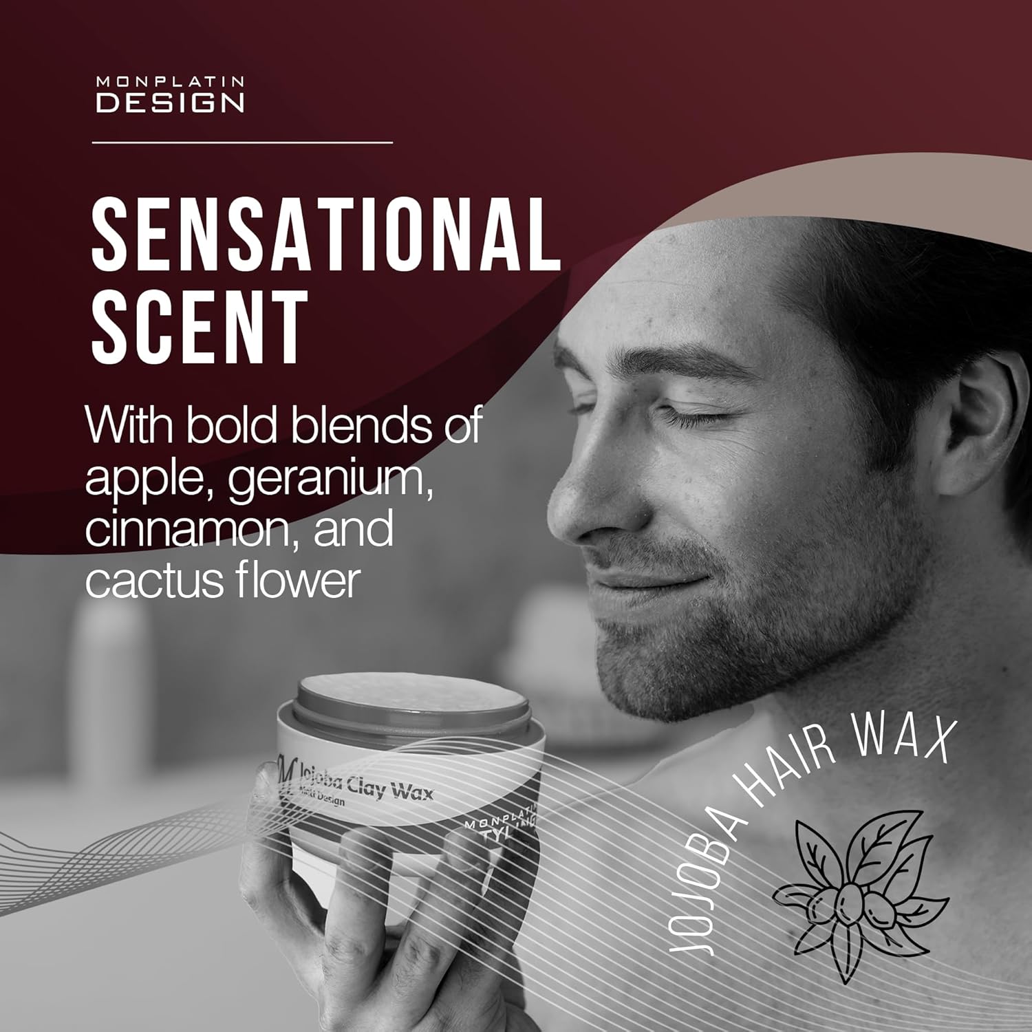 - NOURISHING TREATMENT: Say goodbye to dry, lifeless locks! Our Jojoba Clay Hair Wax is not just your average styling product; it's a nourishing treatment that showers your hair and scalp with organic jojoba extract goodness and smells divine, it's the ideal choice for your daily styling routine. Mon Platin menβs hair wax is easy to rinse out and leaves no sticky or greasy feeling, No residue, just well managed hair.