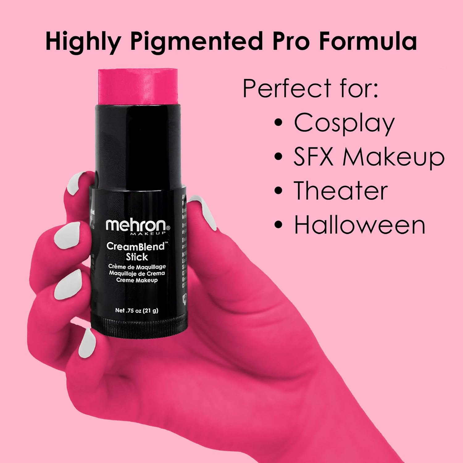 - QUALITY: Made with top quality ingredients in Mehron’s advanced New York facility, CreamBlend Stick Makeup is a versatile product that is perfect for a variety of applications. It is great for stage makeup, pro beauty, Halloween, cosplay, clown makeup, and other types of face and body paint. Available in an array of bold colors and complexion tones, it's easy to find the perfect shade to match your skin tone or create a dramatic look.