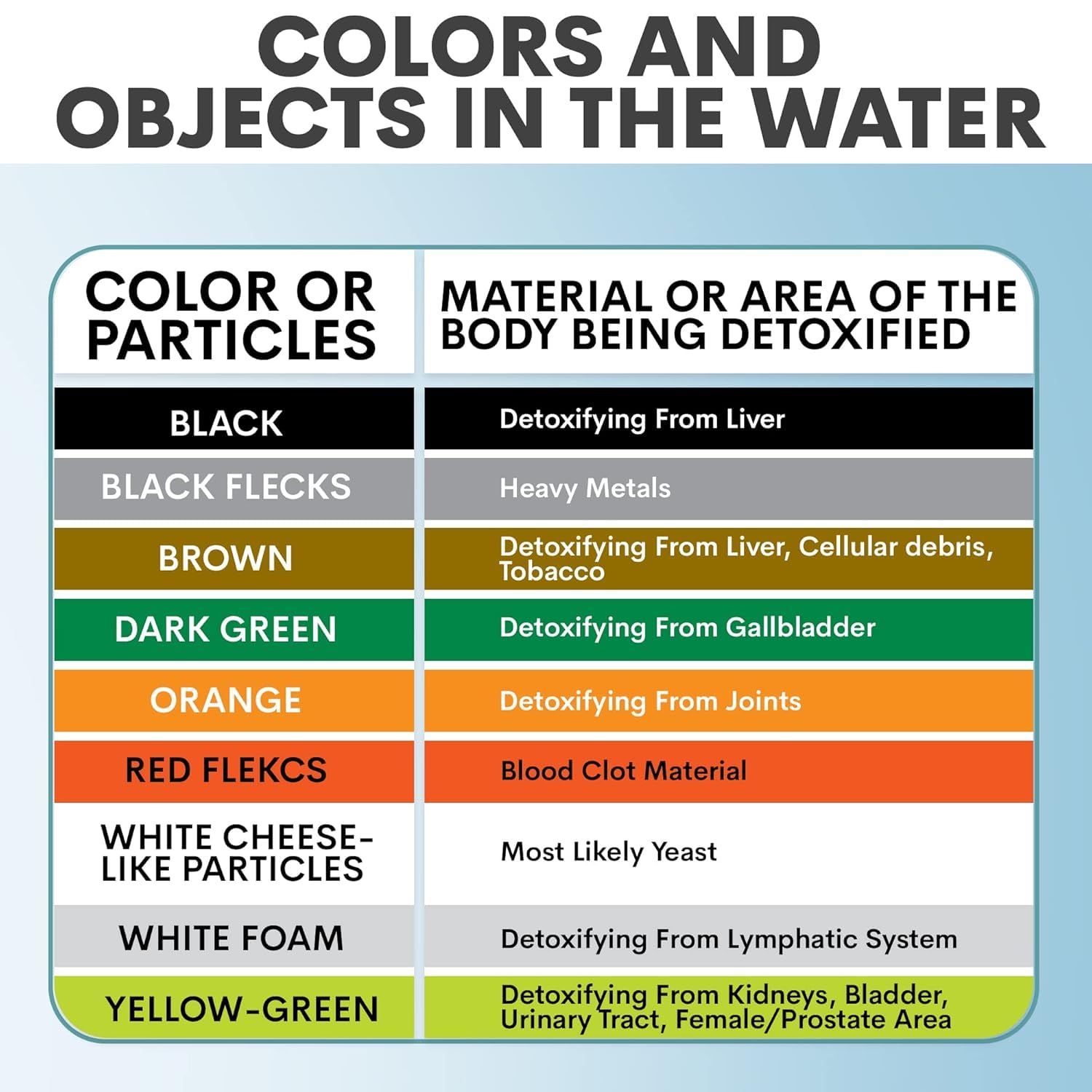 - WHATβS IN THE BOX - This ionic detox foot bath machine comes with everything you need to enjoy a relaxing and cleansing foot bath at home. You will get a controller unit, a 1/4 lb. bag of Detox Sea Salt, two reusable arrays, a white 12QT basin, an instruction manual, an ionic detox foot bath brochure, and a 16-page informational booklet.