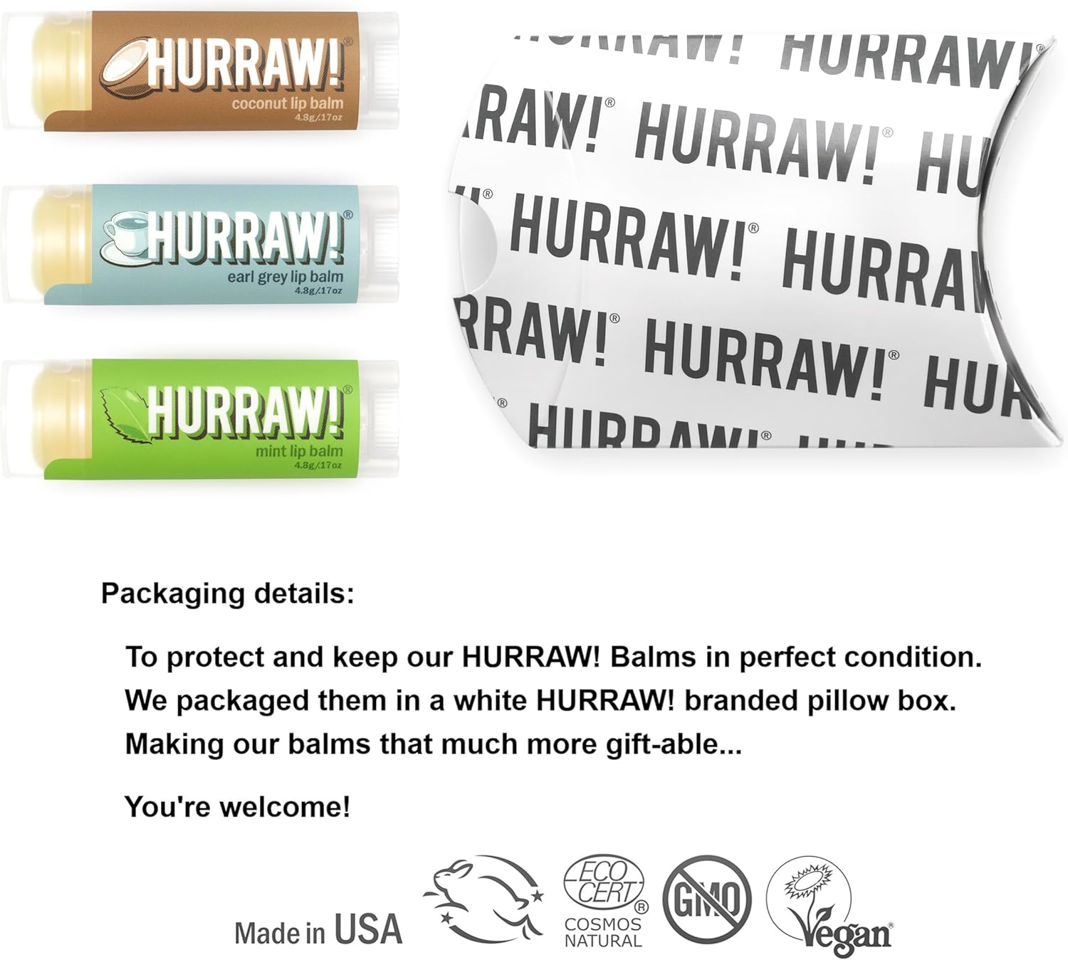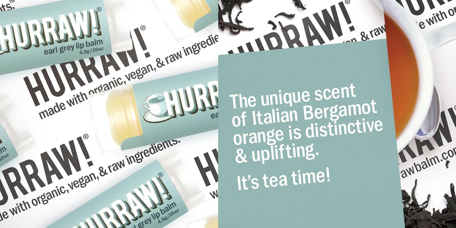 - THREE 4.8g/.17oz Oval Tubes of HURRAW! Lip Balm packaged in a white HURRAW! branded pillow box. COCONUT Balm (Raw Coconut Oilโฆ. Not too beachy, a little toasty... coconut perfection), EARL GREY Balm (You'll be 'loving tea' all day long), MINT Balm (long lasting minty treat for your lips!). Made with certified organic, vegan, and raw ingredients. Hurraw! Lip Balms are certified 100% all natural origin, cruelty and gluten free. Non-GMO. Bee, Shea, Soy and Palm Free.