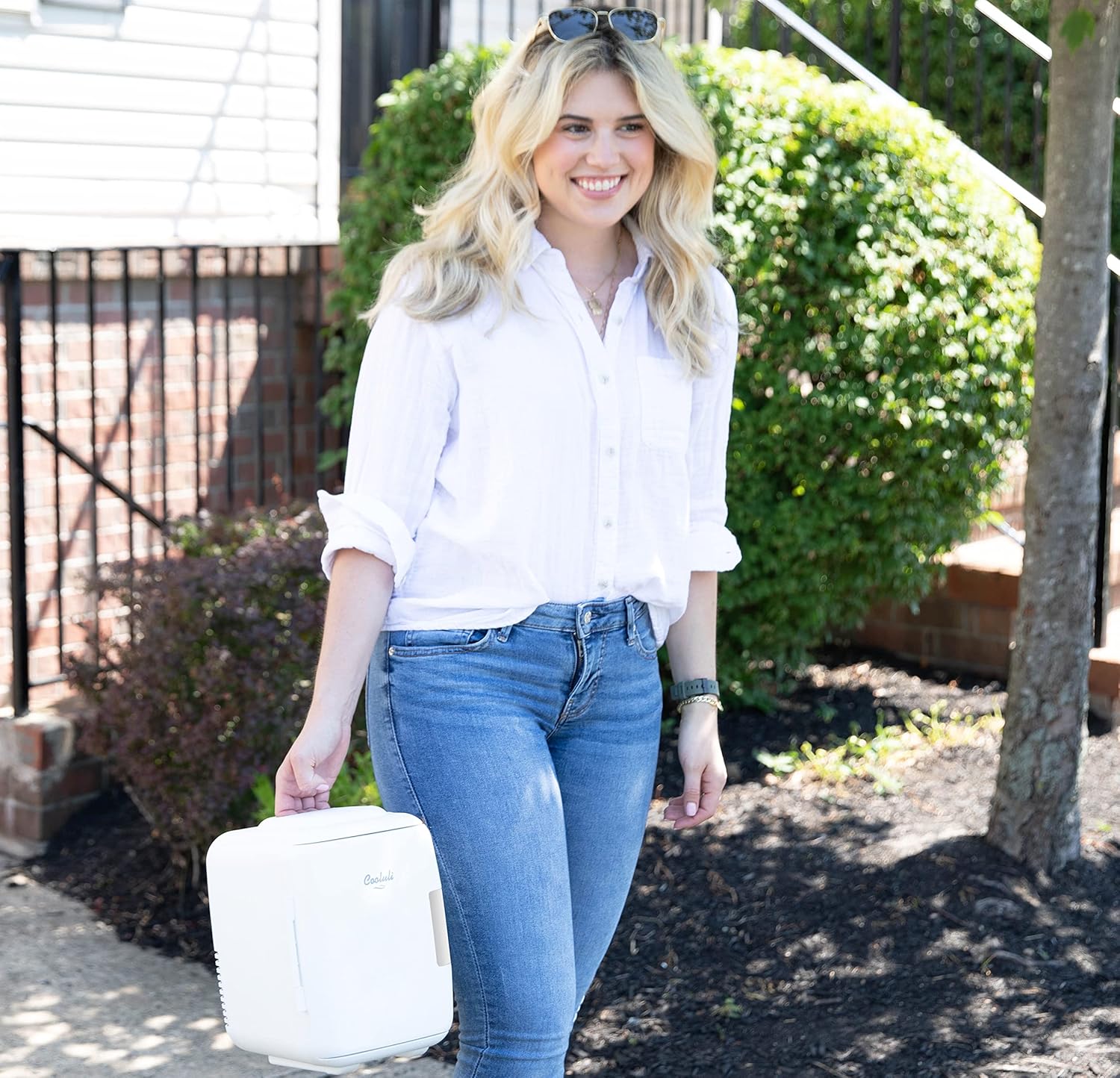 - SLEEK, DURABLE DESIGN: The Cooler & Warmer has a beautiful matte finish on the outside. Sleek enough to leave at home or in the office โ fits perfectly on your desk. Simply wipe it down to clean the inside and outside. The lightweight, sturdy polypropylene (PP) plastic design and magnetic self-lock latching door along with included DC adapter makes the Cooler/Warmer portable. The carrying handle on top makes transporting the appliance even more convenient.