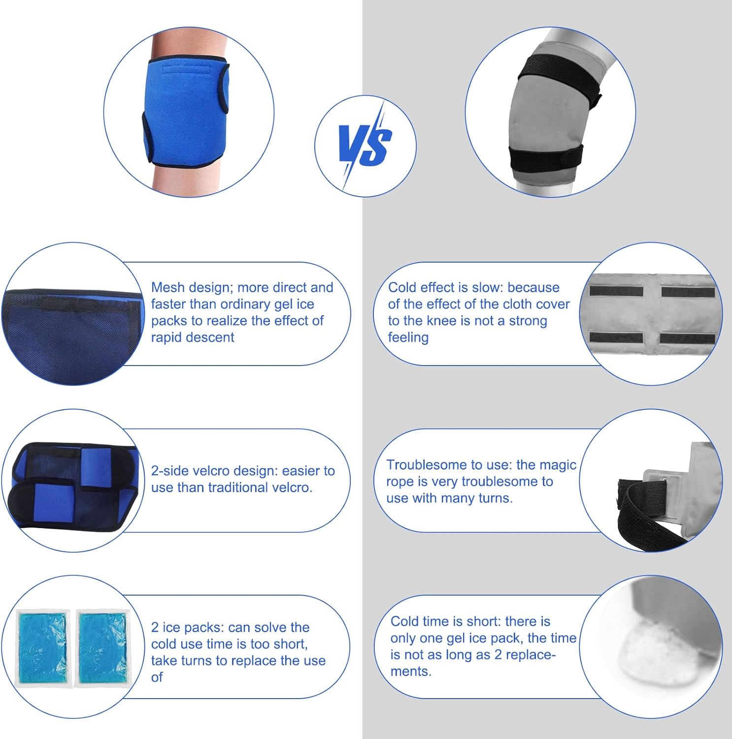 - 【Pro Design for Knee】 - Knee ice pack wrap designed for knee, large enough to cover 7.8'' x 5.5'' knee area, the attached hooks ensure the gel ice pack to be secured around the injured area for hands-free application and a full range of movement. Besides applied on the knee, it can be applied on leg, waist, elbow or any other part.