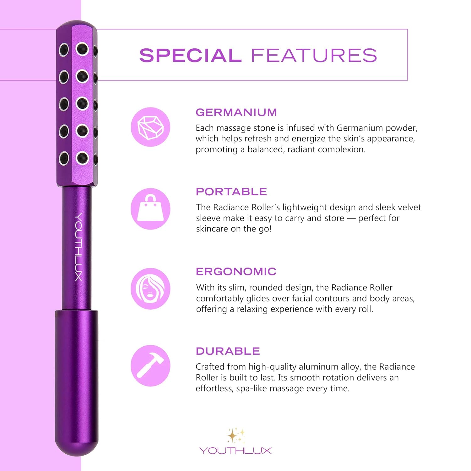 Radiance Roller – Germanium Stone Facial Massage Tool for Lifting, Sculpting, De-Puffing, Glow Boost, Energizing & Cooling Effect (Purple)