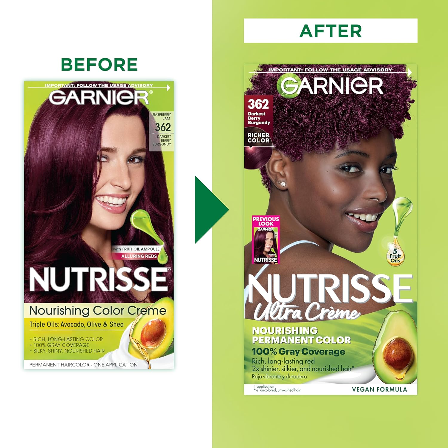 Garnier Hair Color Nutrisse Nourishing Creme, 362 Darkest Berry Burgundy (Raspberry Jam) Red Permanent Hair Dye, 2 Count (Packaging May Vary)