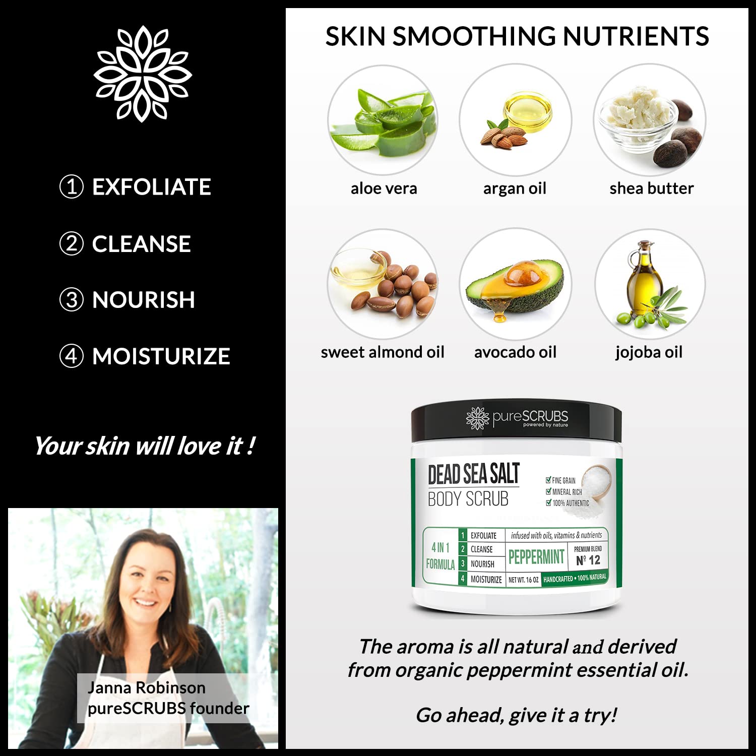 - GET ULTRA SMOOTH SKIN FAST - THIS WORKS! Our unique “4 in 1 Formula” does everything a body scrub should do and more - EXFOLIATE, CLEANSE, NOURISH & MOISTURIZE. Fine grain dead sea salt infused with essential oils, nutrients and skin softeners helps to smooth away rough, bumpy, and uneven textures to instantly reveal your true soft, healthy and radiant skin. You'll love the peppermint aroma!