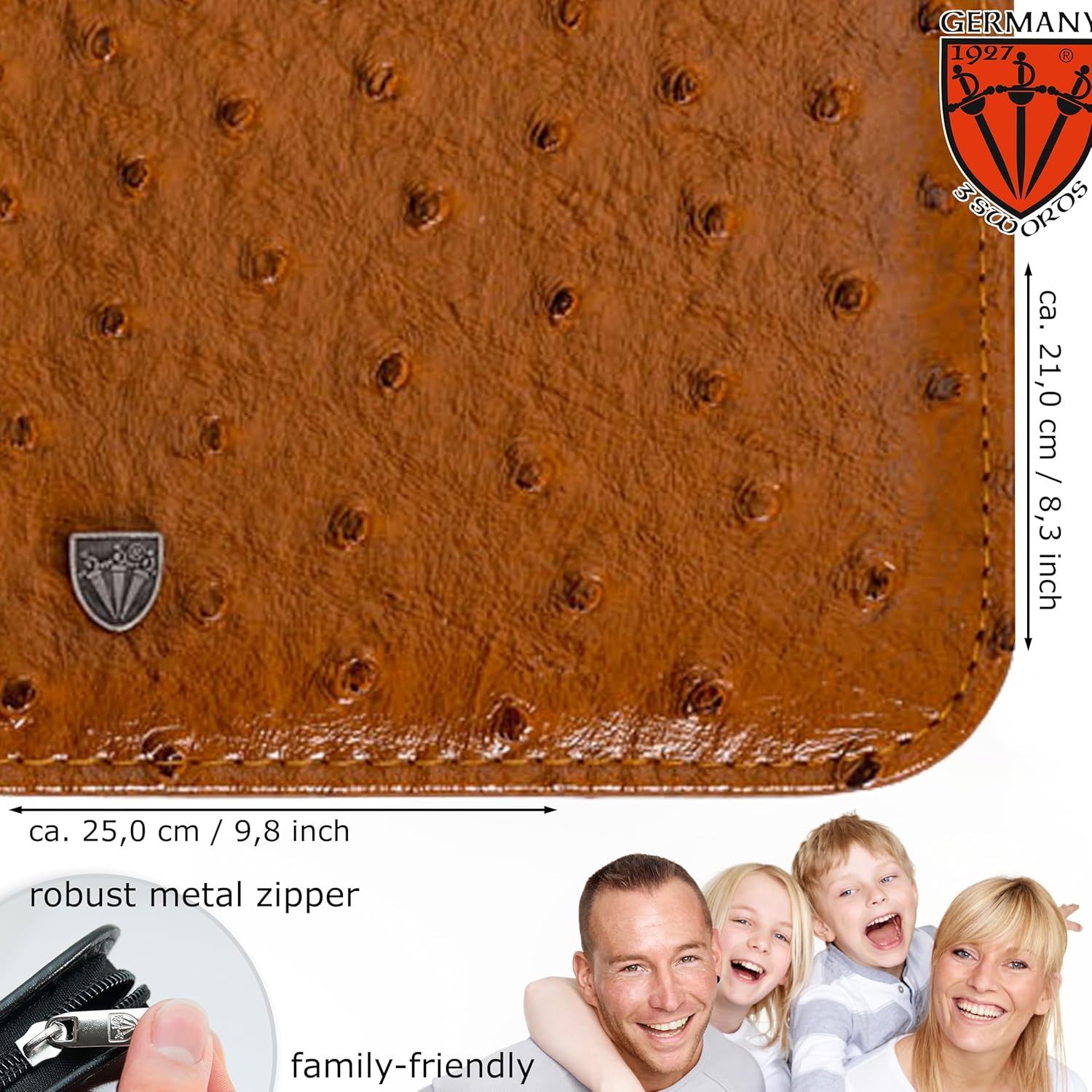 - CASE: Synthetic leather ostrich cognac, size ca. 25,5 x 21,0 x 3,0 cm. Our organizers are made of high-grade fashion or classic materials. Additional equipment: Microfiber cleaning cloth for cleaning steel items, general info sheet โFinger - Nail Groomingโ.