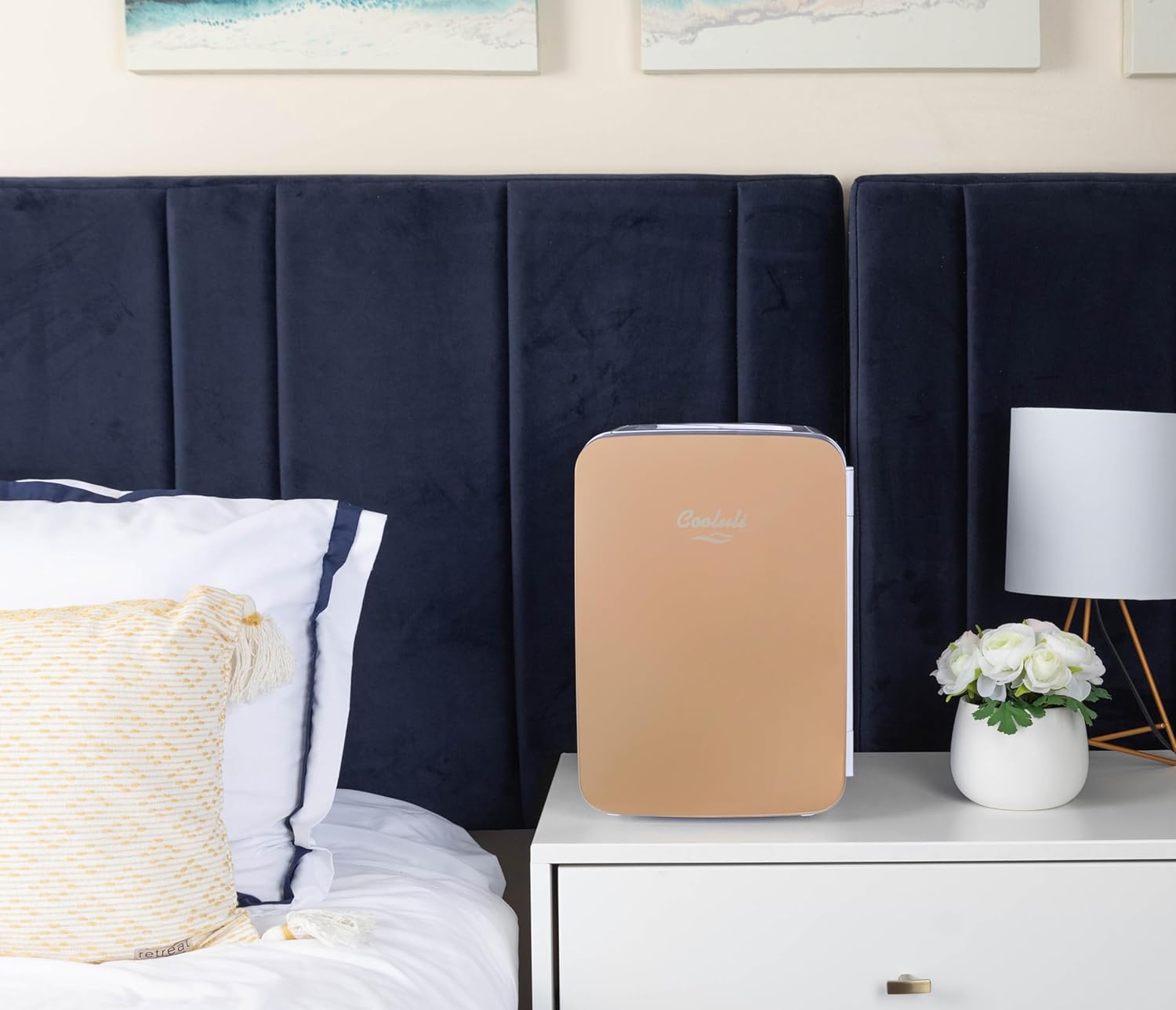 Cooluli 10L Mini Fridge for Bedroom - Car, Office Desk & College Dorm Room - 12v Portable Cooler & Warmer for Food, Drinks, Skincare, Beauty & Makeup - AC/DC Small Refrigerator with Glass Front, Gold