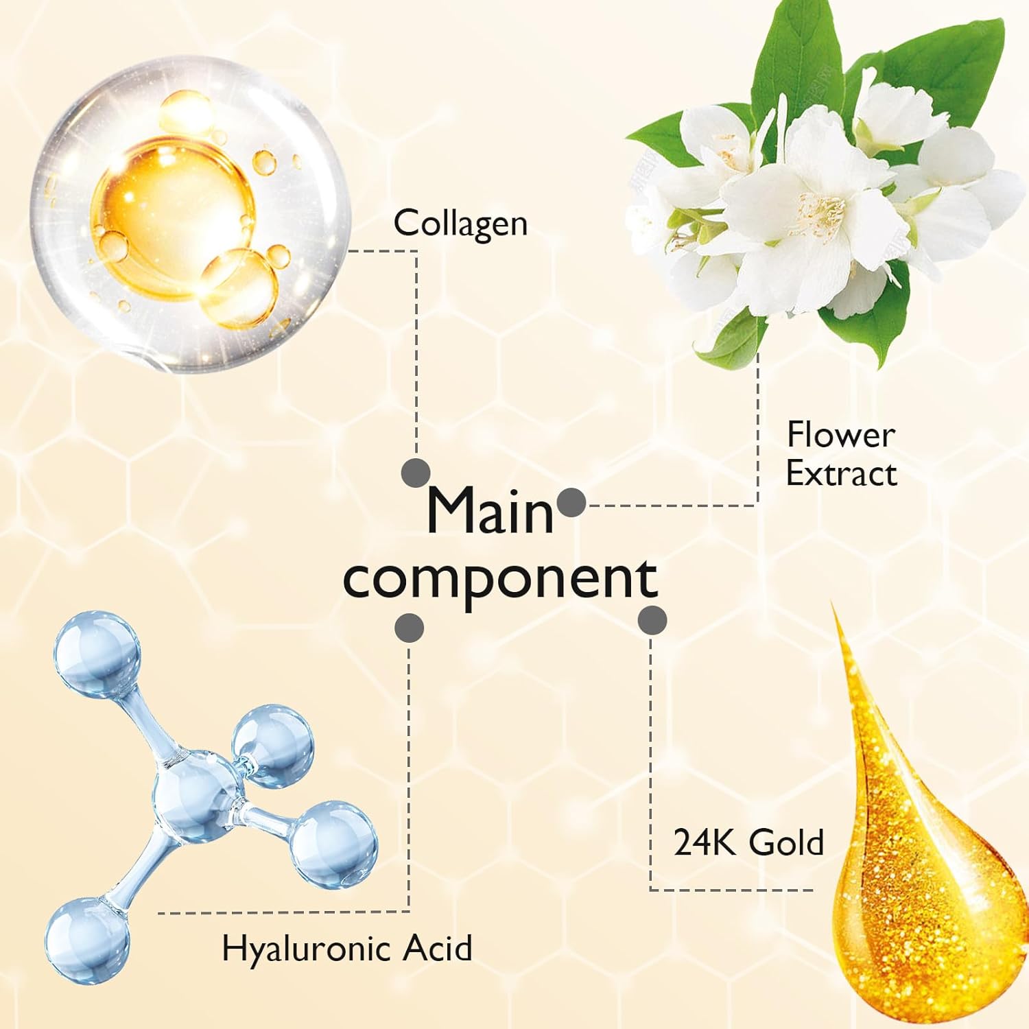 - THE PERFECT BLEND OF INGREDIENTS FOR YOU - 24k gold, plumping collagen, hydrating hyaluronic acid, refreshing vitamin c serum, anti aging seaweed polysaccharides, brightening liquorice extract, natural plant extracts, moisturising oat peptide and calming rose essential oil. Free from parabens and alcohol