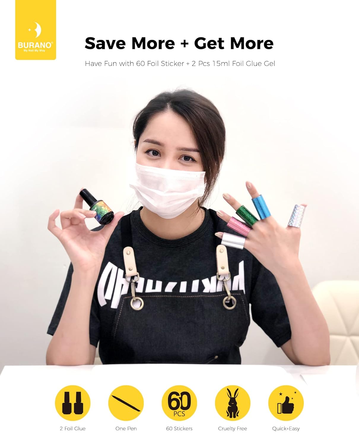 BURANO Nail Art Foil Glue Gel, 15ML 2 Bottles with 60PCS Foils Sticker, Nails Designer Adhesive Transfer Art UV LED Lamp Required