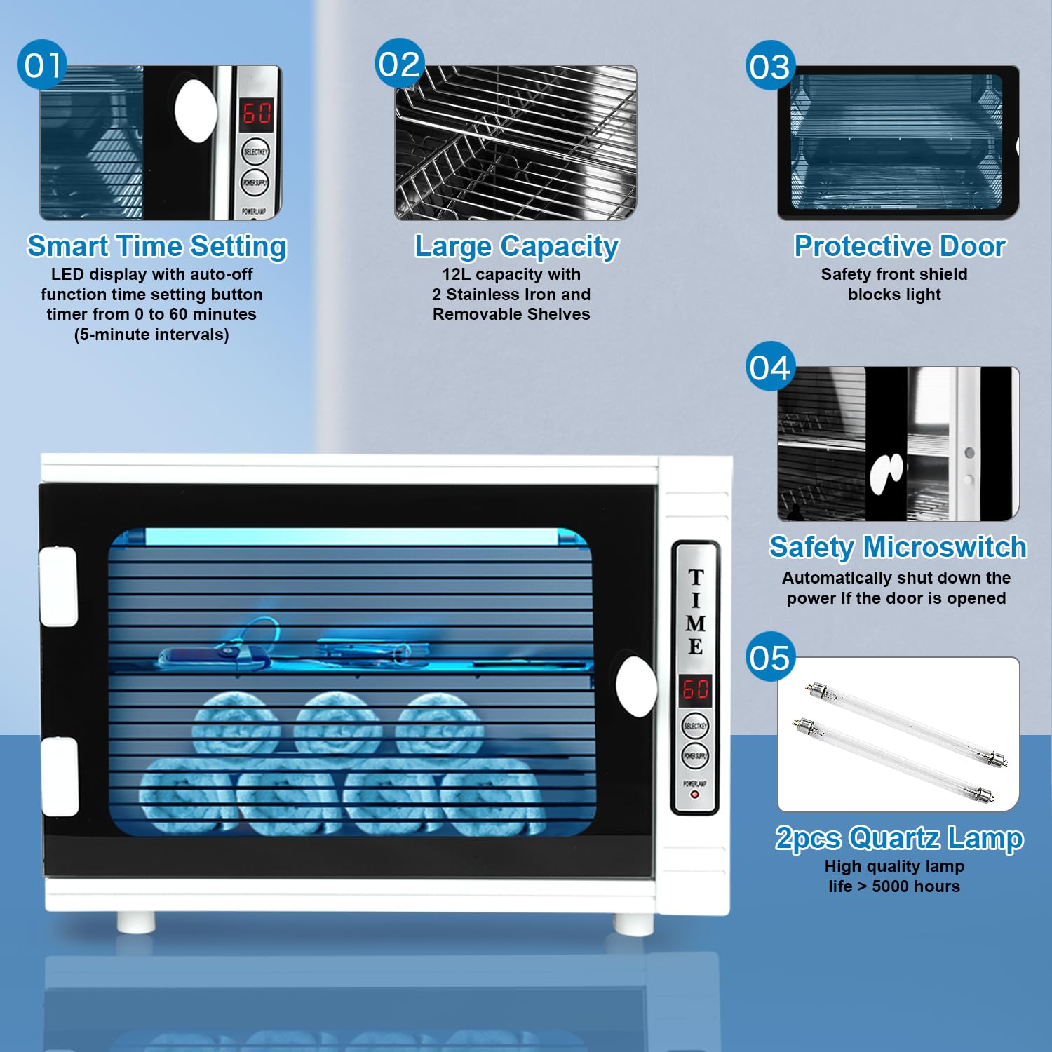 - 💎【Buy with Confidence】Our cleaning cabinet is equipped with durable quartz lamps with a service life of up to 5000 hours. Packing list: Cleaning Cabinet *1, Lamp *2 (1 spare lamp), User Manual*1. There are four protective feet on the bottom of the tool cabinet to protect the table from being scratched by friction with the table. Order now to begin easily cleaning everyday objects! 1-year manufacturer warranty. Any issues or concerns, our team is here to help!