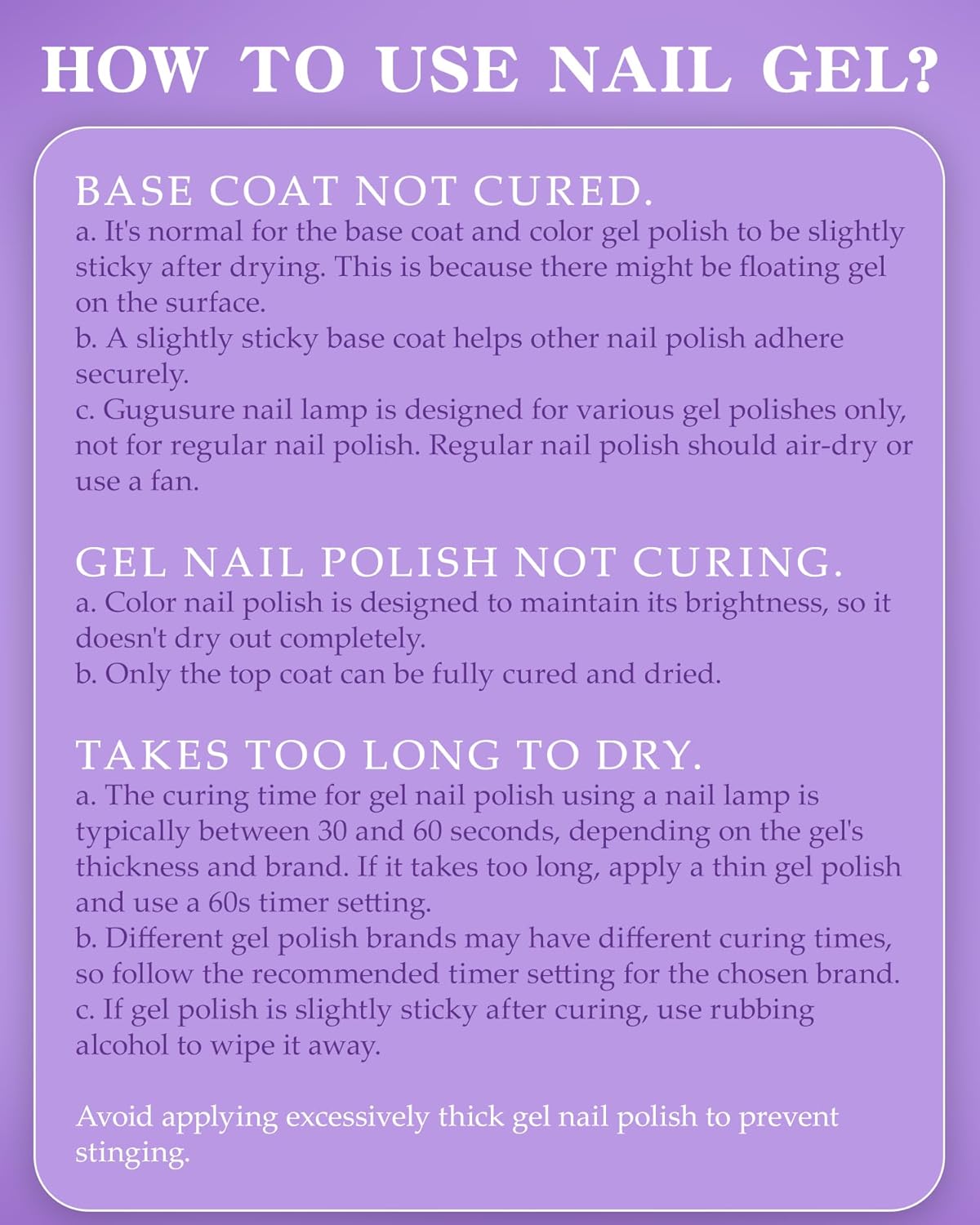 - [4Timmer settings & Burning-free Curing] Freely switch and control curing time with 4 timers (30s-60s-90s -120s low heat mode), Gugusure UV gel nail lamps meet all your needs for gel polish and ensure the color of nail gel! Unlike conventional nail art, the low heat design delivers more gentleness. Start your manicure intelligence era.