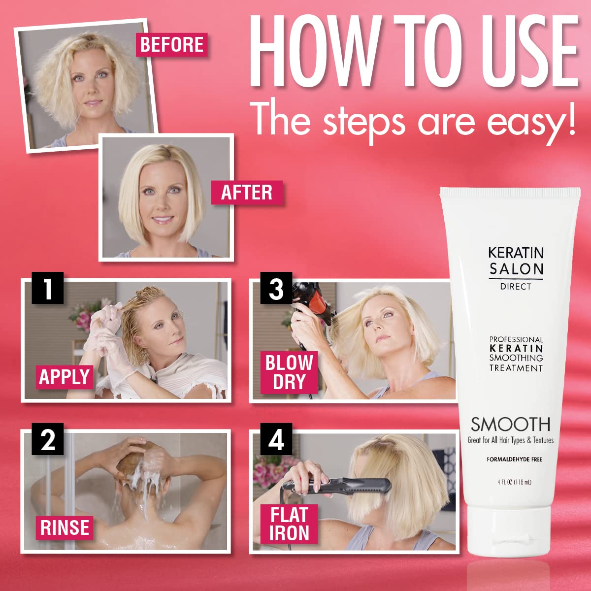- CONVENIENT AND SAFE FOR YOU TO USE AT HOME: (1) Apply it to your clean damp hair (2) Leave it on your hair for the recommended amount of time (3) Blow dry your hair and then flat iron until silky. Thatβs it! Style any way you want! Your hair will look like you just left the salon, and the gorgeous look and feel will last for months. Your hair can be curled or dried with a round brush for volume - the fabulous look only professional treatment can deliver!