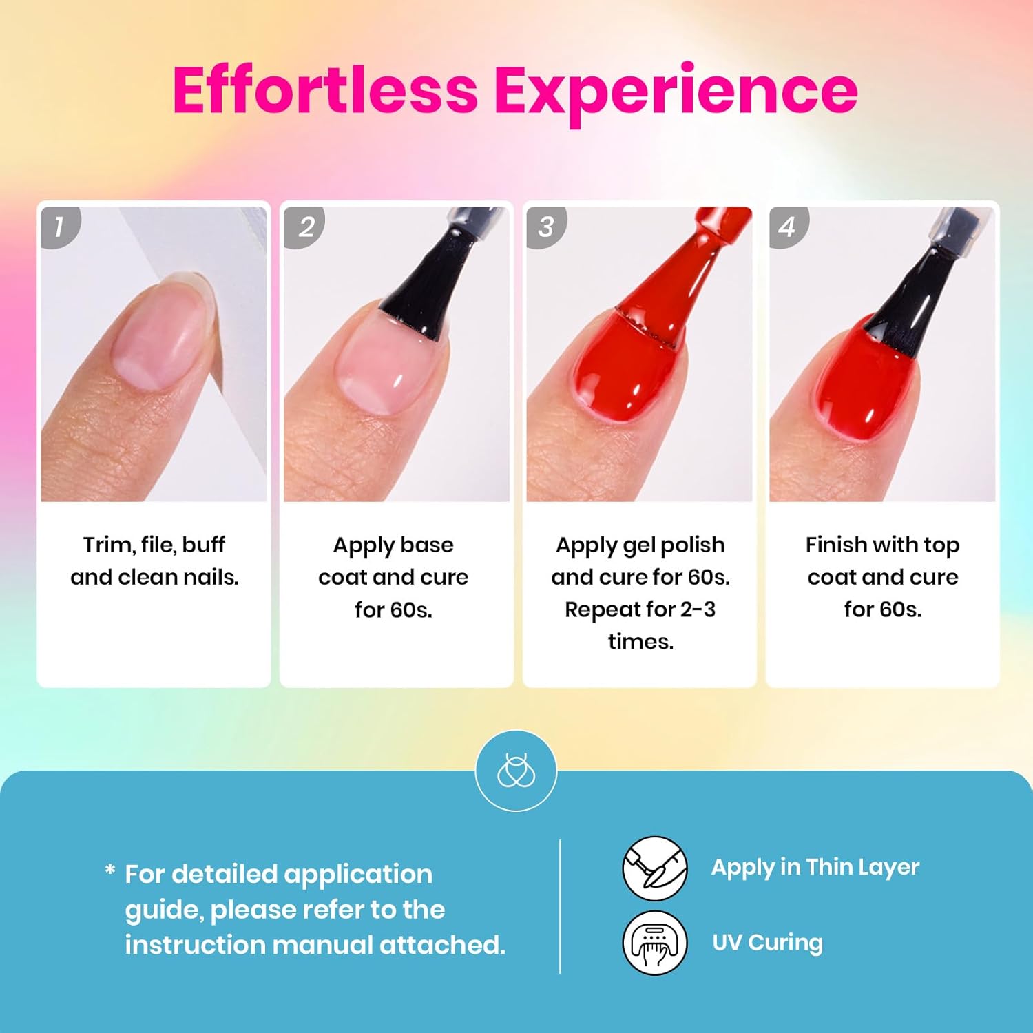 - Glossy & Long-Lasting Finish: Achieve salon-quality nails with a smooth, high-shine look. Our UV LED soak-off gel formula provides up to 3+ weeks of wear without chipping or fading when applied properly.