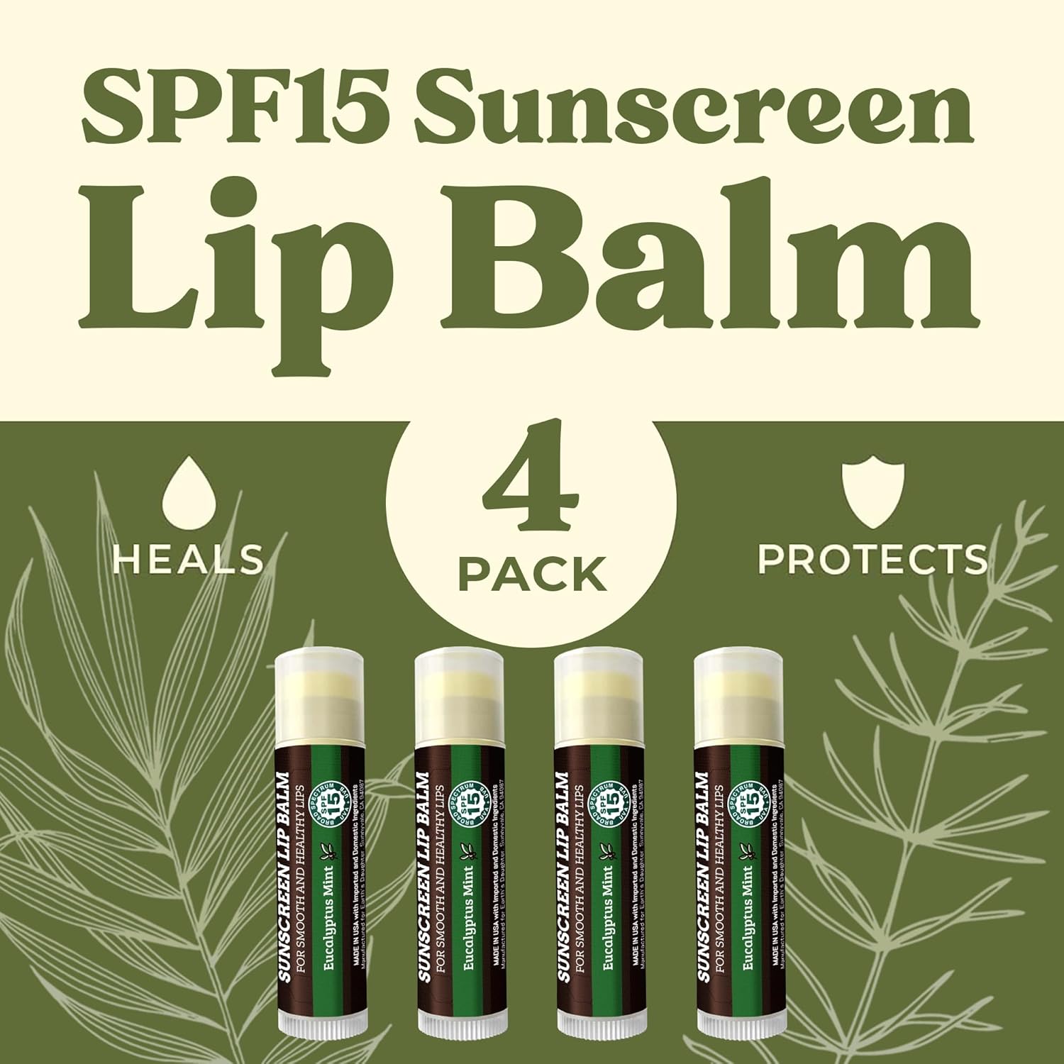 - 4 PACK of SPF 15 SUNSCREEN LIP BALM โ Delicious Eucalyptus Mint. Everyone loves our mint lip balm with SPF 15 sun protection, organic beeswax, organic coconut oil and other premium organic hydrating ingredients to protect and moisturize all day long. Our lip balm is great for everyday protection and safe for the whole family