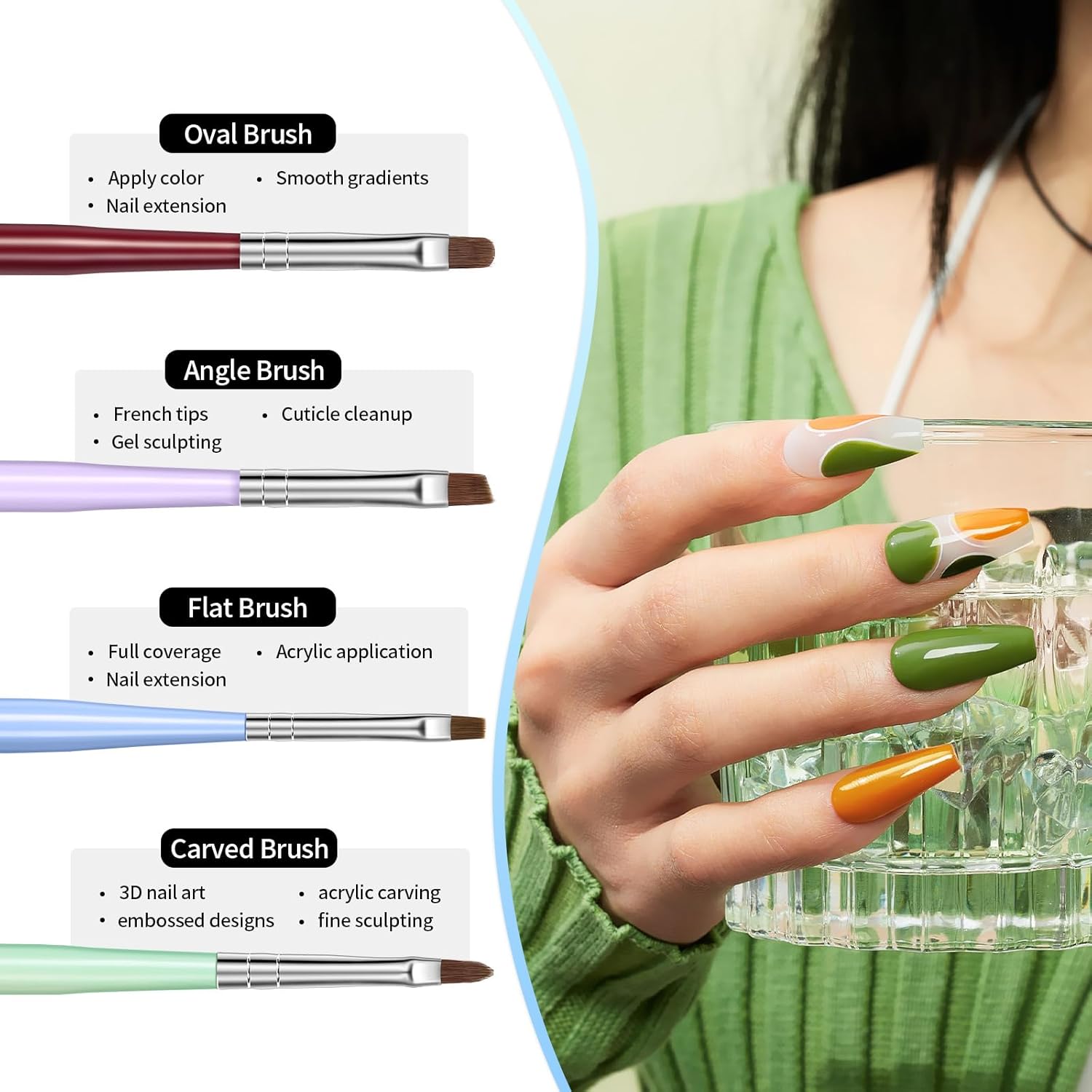 - MULTIFUNCTIONAL NAIL ART BRUSHES: The nail brush set comes with 6 different nail brushes, Including a gel nail brush, poly extension gel brush, french tip brush, nail carved pen, nail liner brush, and nail dotting pens, works well with nail polish.