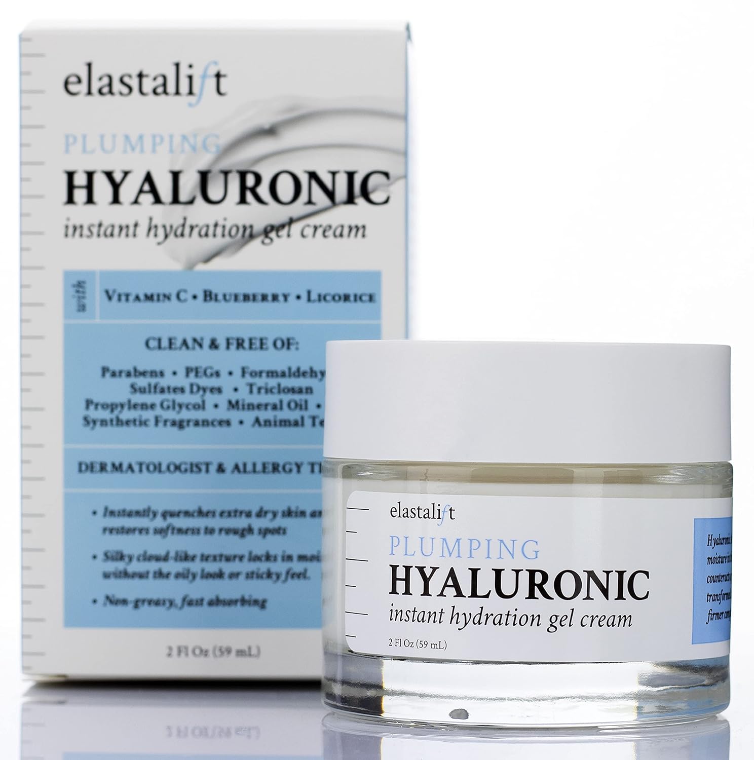 - RELAX, HYDRATE, RENEW, & RESTORE β Dermatologist-Tested, Clinically-Tested, Cruelty-Free, Non-Greasy, & PH Balanced Formula. Free From: Parabens, Drying Alcohols, PEGs, Sulfates, Dyes, Propylene Glycol, & Talc. Manufactured in our FDA-Regulated & Inspected Laboratory in Chicago, USA. We are confident that you'll love the way this Elastalift Hyaluronic Acid Face Gel makes your skin look and feel, and we stand behind our product with a satisfaction-guarantee.