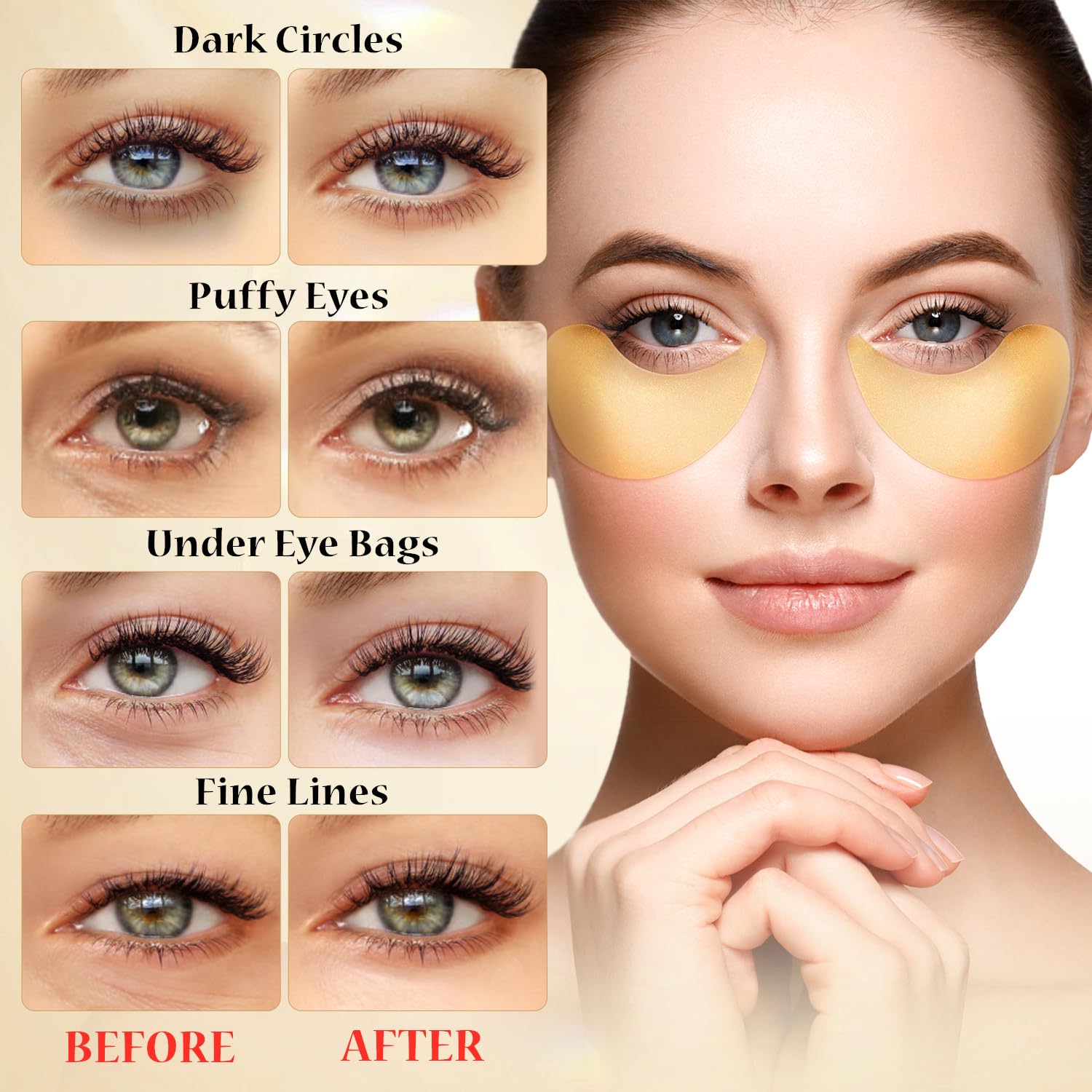 - [Anti-Aging Eye Patches]-With 24k gold and collagen, hydrate and nourish your skin around eyes, make your skin plump and shiny. Besides,this eye patches can effectively reduce fine lines and wrinkles and help skin to keep youthful vigor.