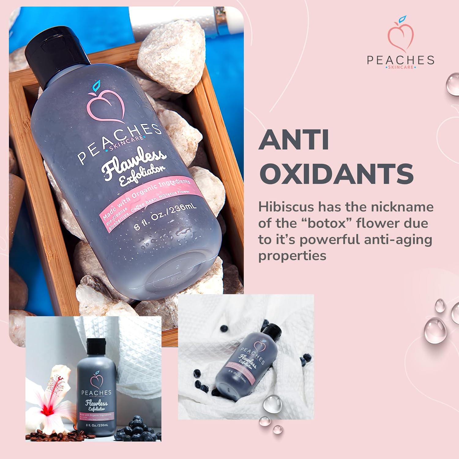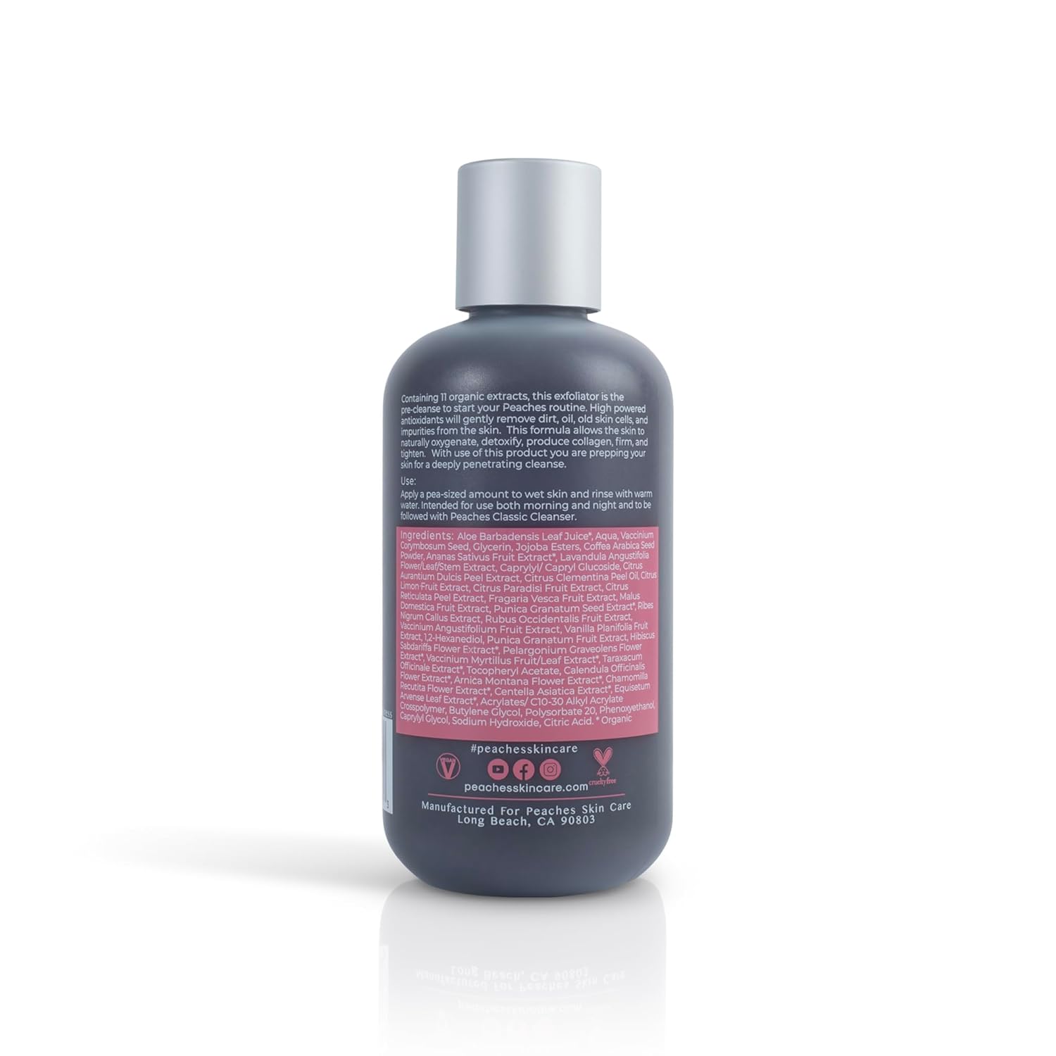 - Facial Exfoliator - Deeply cleanse and exfoliate your skin by using the Peaches’ Exfoliating Face Scrub. This 8 oz bottle of face exfoliant is created from ingredients that allow oxygenation and cleansing of all skin types.