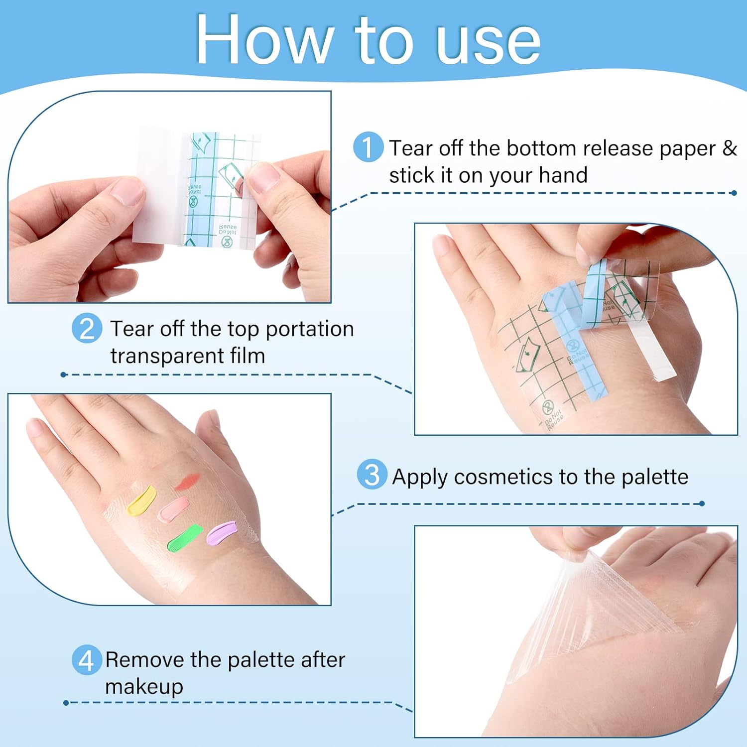 - Simple to Apply: just tear off the transparent film of the cosmetic makeup palette first, and then apply it on your hands, smear the cosmetics on the palette, mix the cosmetics with your hands or tool, last remove the palette after use, without extra hand washing or trouble, saving your time and energy
