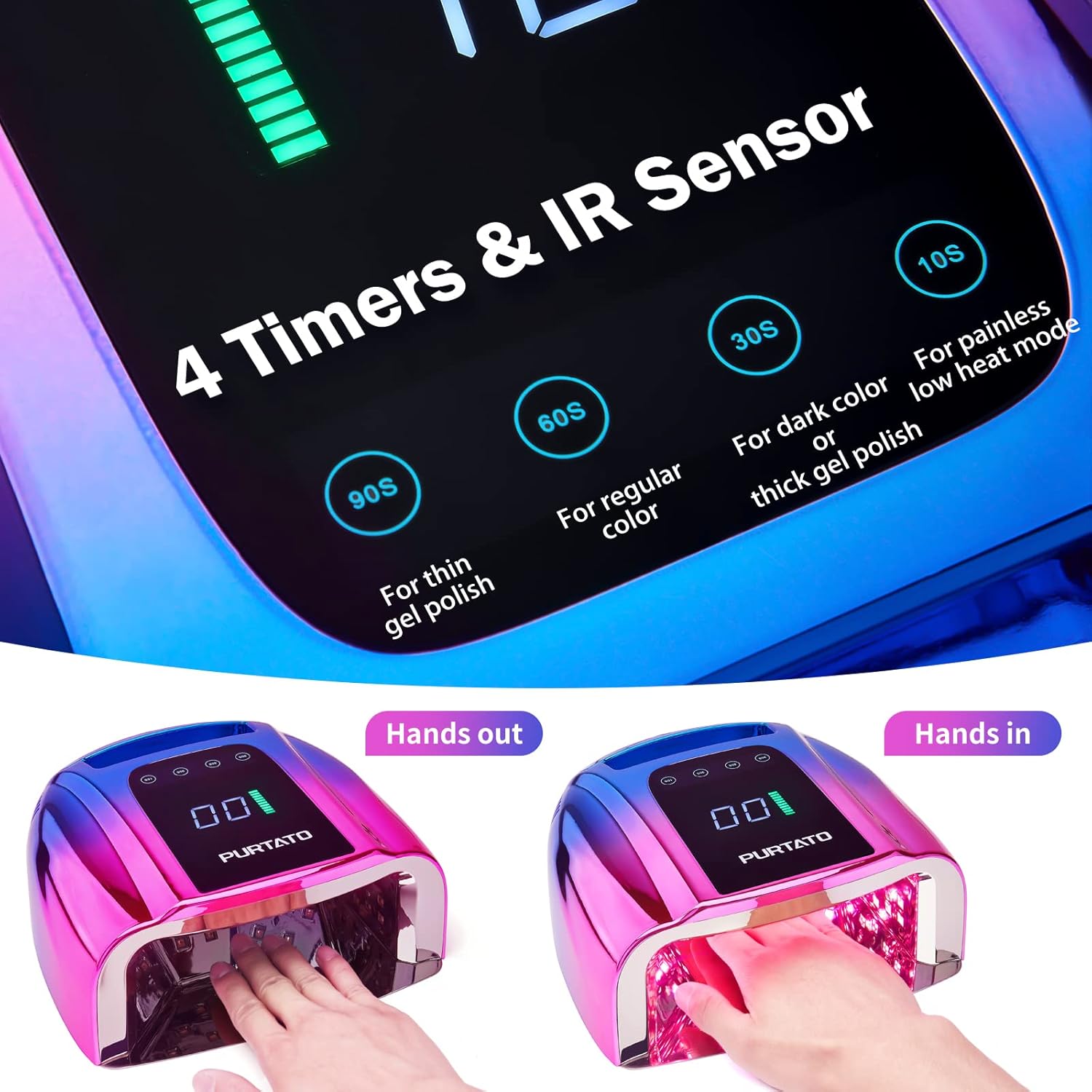 - 4 TIMERS & INFRARED SENSOR - PURTATO nail Lamp provides 10S / 30S / 60S / 90S flexible drying options and the time will be displayed on the large LCD screen;Your manicure & pedicure will be more fun and energy efficient with smart sensor;Hands/feet in, lamp on; Hands/feet out,lamp off;Heat dissipation hole avoid overheat;Very smart, portable, fast, quiet for using
