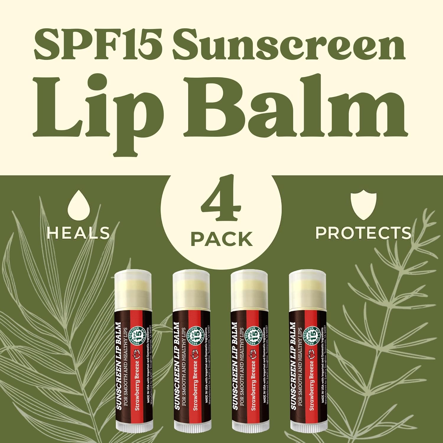 - 4 PACK of SPF 15 SUNSCREEN LIP BALM โ Delicious Strawberry Flavor. Everyone loves our strawberry lip balm with SPF 15 sun protection, organic beeswax, organic coconut oil and other premium organic hydrating ingredients to protect and moisturize all day long. Our lip balm is great for everyday protection and safe for the whole family
