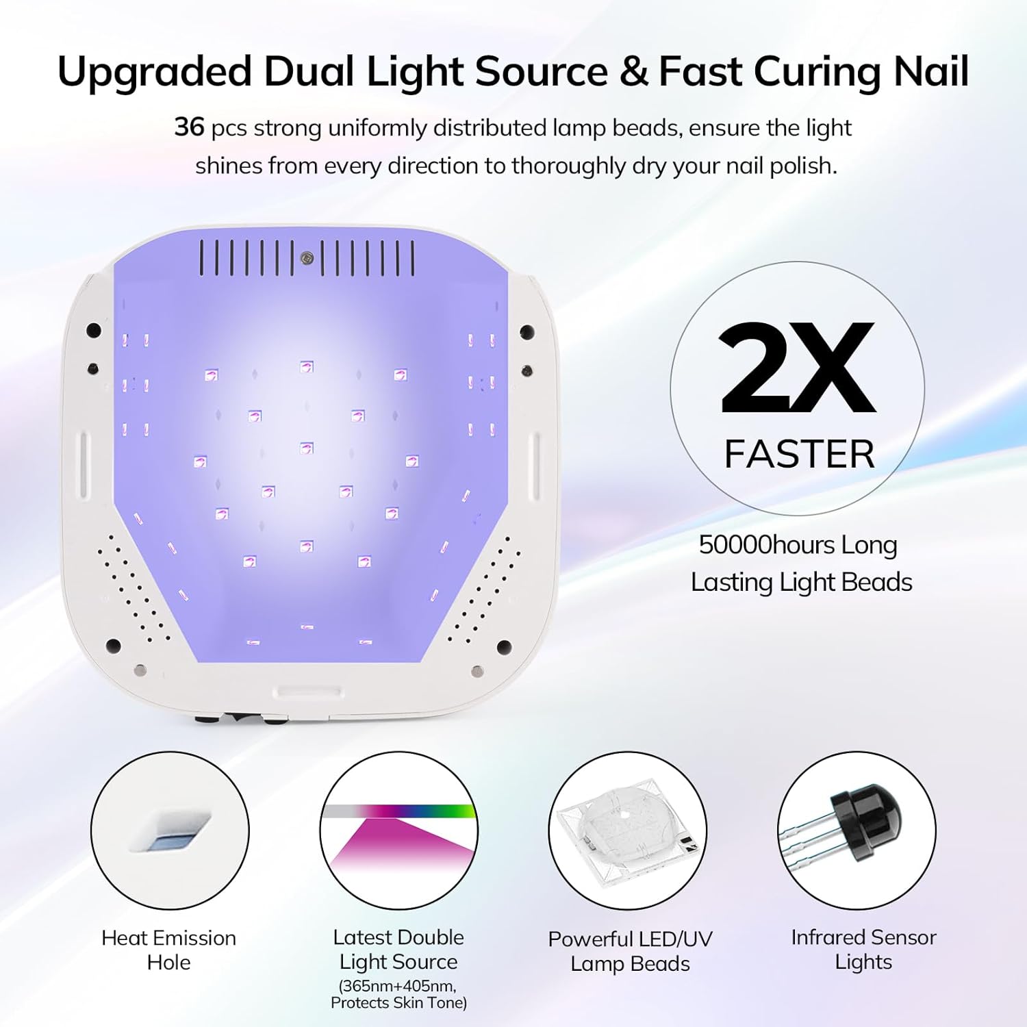 - 【Dual Light Source & Fast Curing Nail】Lavinda gel UV led nail lamp comes with 30 dual light source lamp beads, the UV light shines from all directions and dries gel nail polish quickly. And the light is soft (365nm+405nm) and not glaring which won't hurt your eyes and without tanning your hands. This flash cure lamp can fast dry all types of gel nails. (not for regular nail polish)