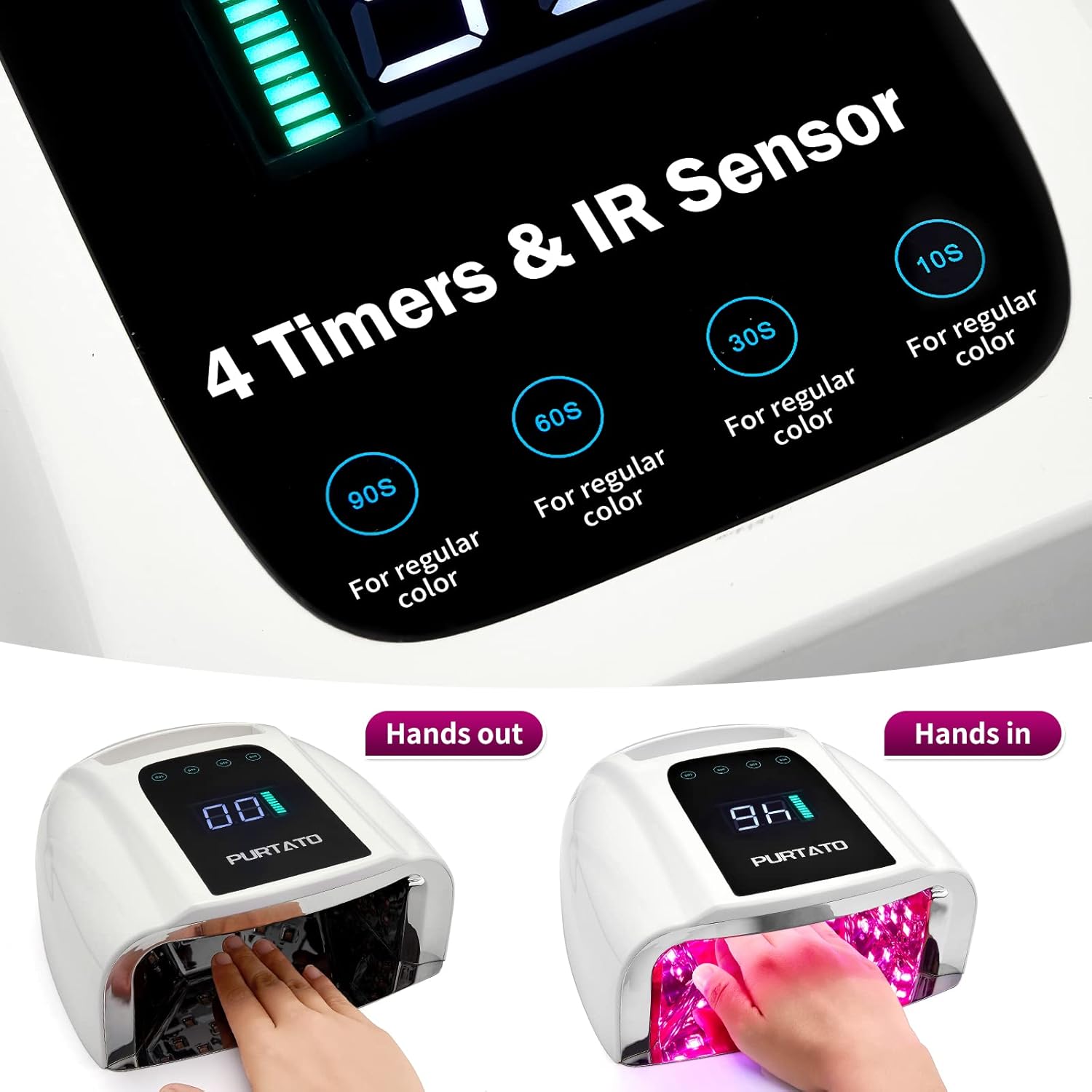 - 【4 TIMERS & INFRARED SENSOR】- PURTATO nail Lamp provides 10S / 30S / 60S / 90S flexible drying options and the time will be displayed on the large LCD screen. Your manicure & pedicure will be more fun and energy efficient with smart sensor. Hands/feet in, lamp on. Hands/feet out,lamp off. Heat dissipation hole avoid overheat.Very smart, portable, fast, quiet for using.