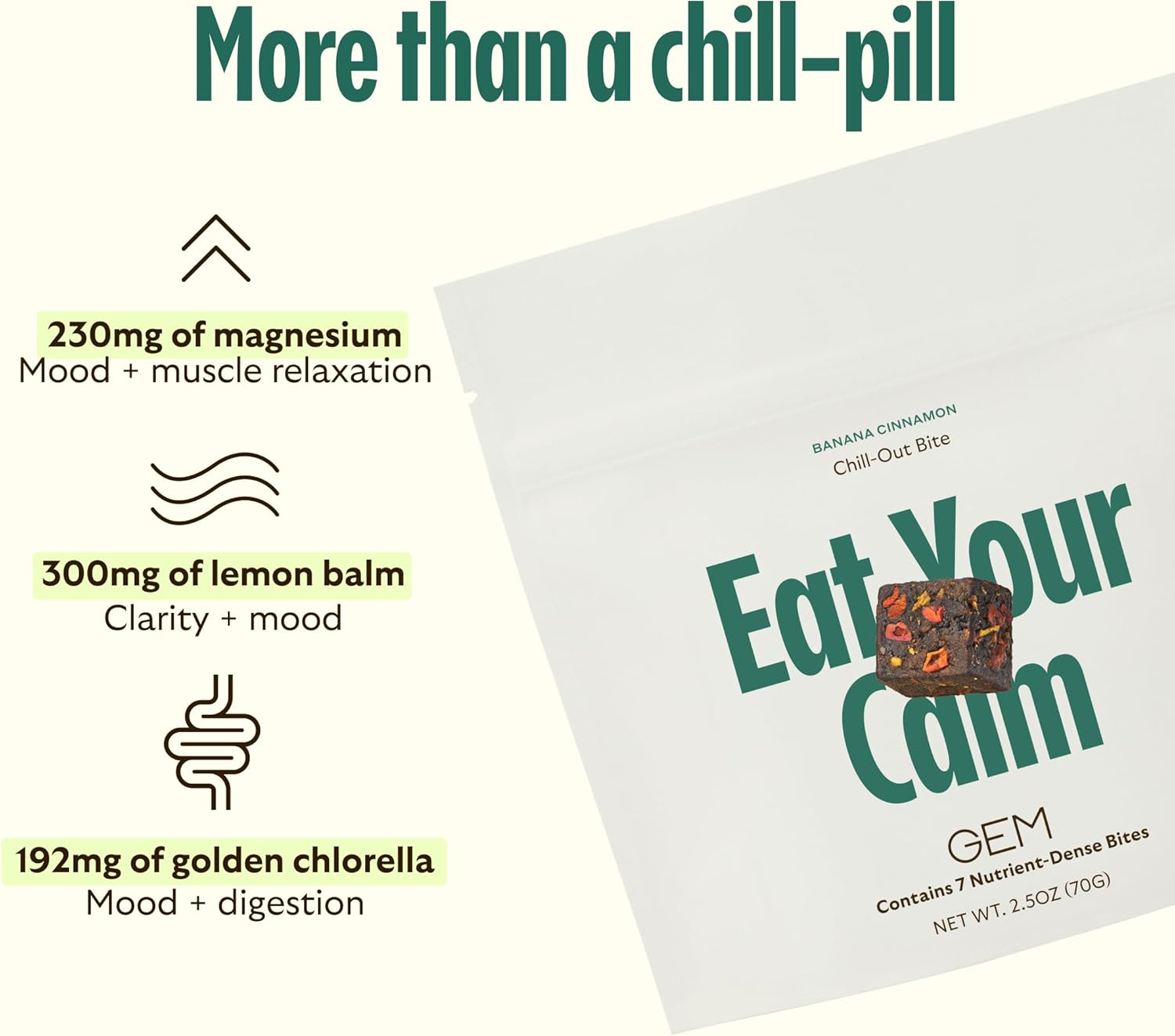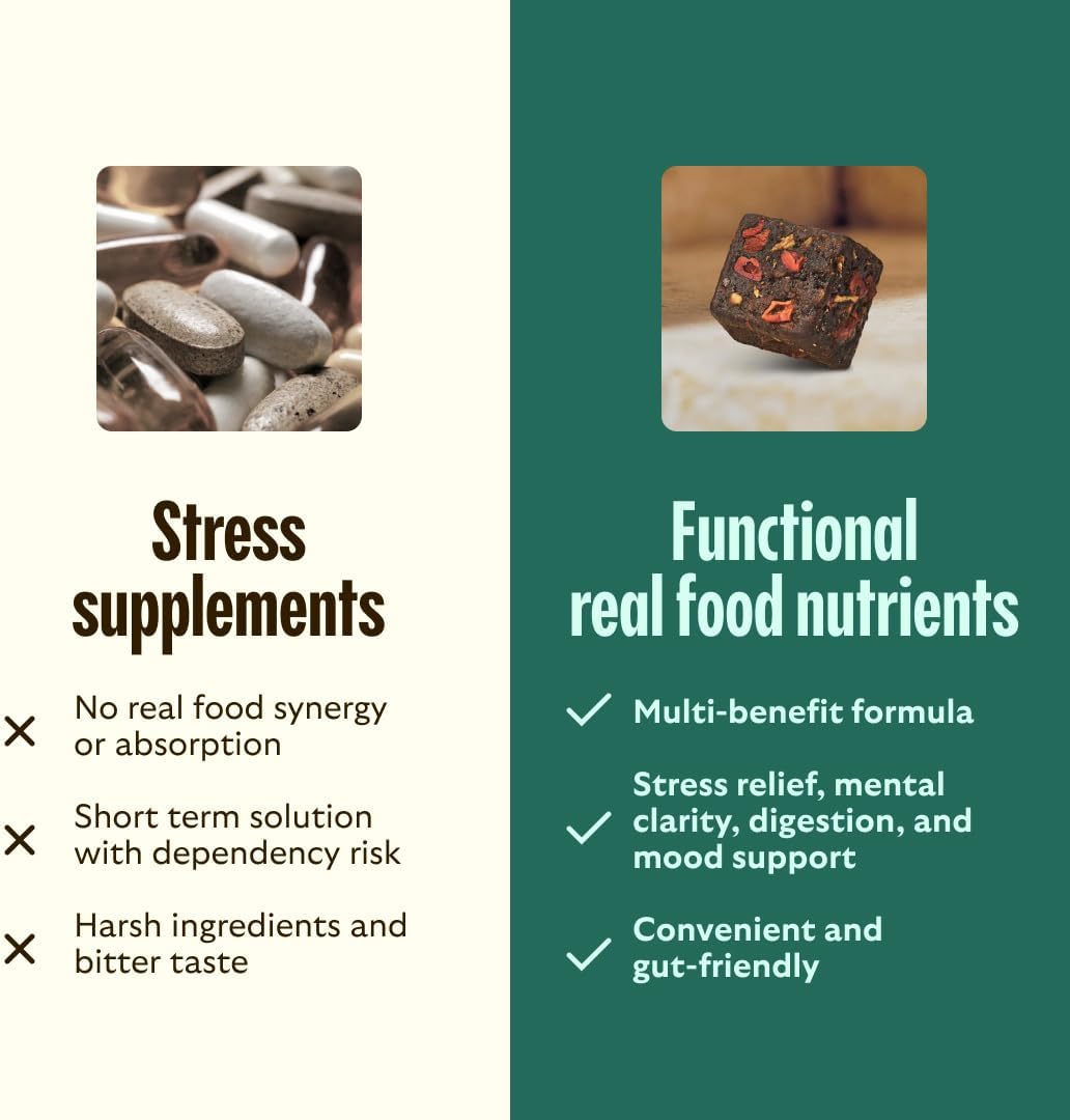 - Boost: Lemon balm and golden chlorella relieve stress, promote focus, and reduce brain fog. One delicious real food Bite filled with 50% of your daily dose of magnesium. Three different forms of magnesium targeting brain, body, and gut for stress, relaxation, and digestive relief. Each bite contains lemon balm with clinical benefits to help with cognition, focus, and mood support.