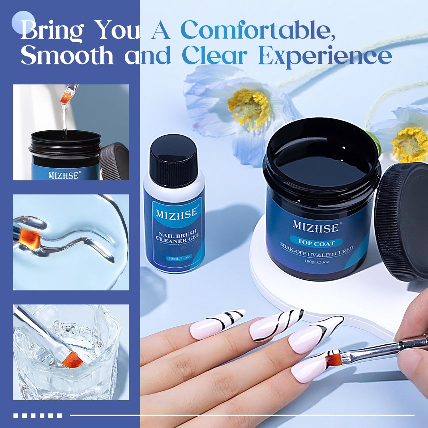 - Lager Capacity Gel Top Coat: MIZHSE's upgraded 3.5oz/100ml top coat gel kit with 70% more capacity than other brands, can be used 300+ times and is great value for money. This nail top coat kit includes 100ml top coat gel, 30ml brush Cleaner Gel, and Nail Art Brush. Payless and get more