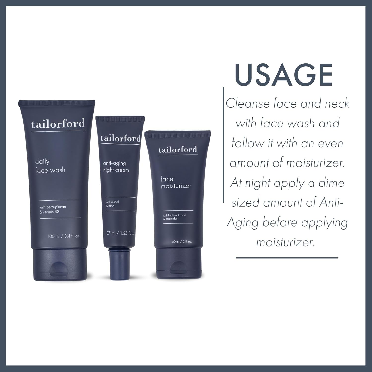 - 3 STEP SKIN CARE: Includes one 3.4 oz bottle of Tailorford Daily Face Wash, one 2 oz bottle of Tailorford Face Moisturizer, and one 1.25 oz tube of Tailorford Anti-Aging Nightcream