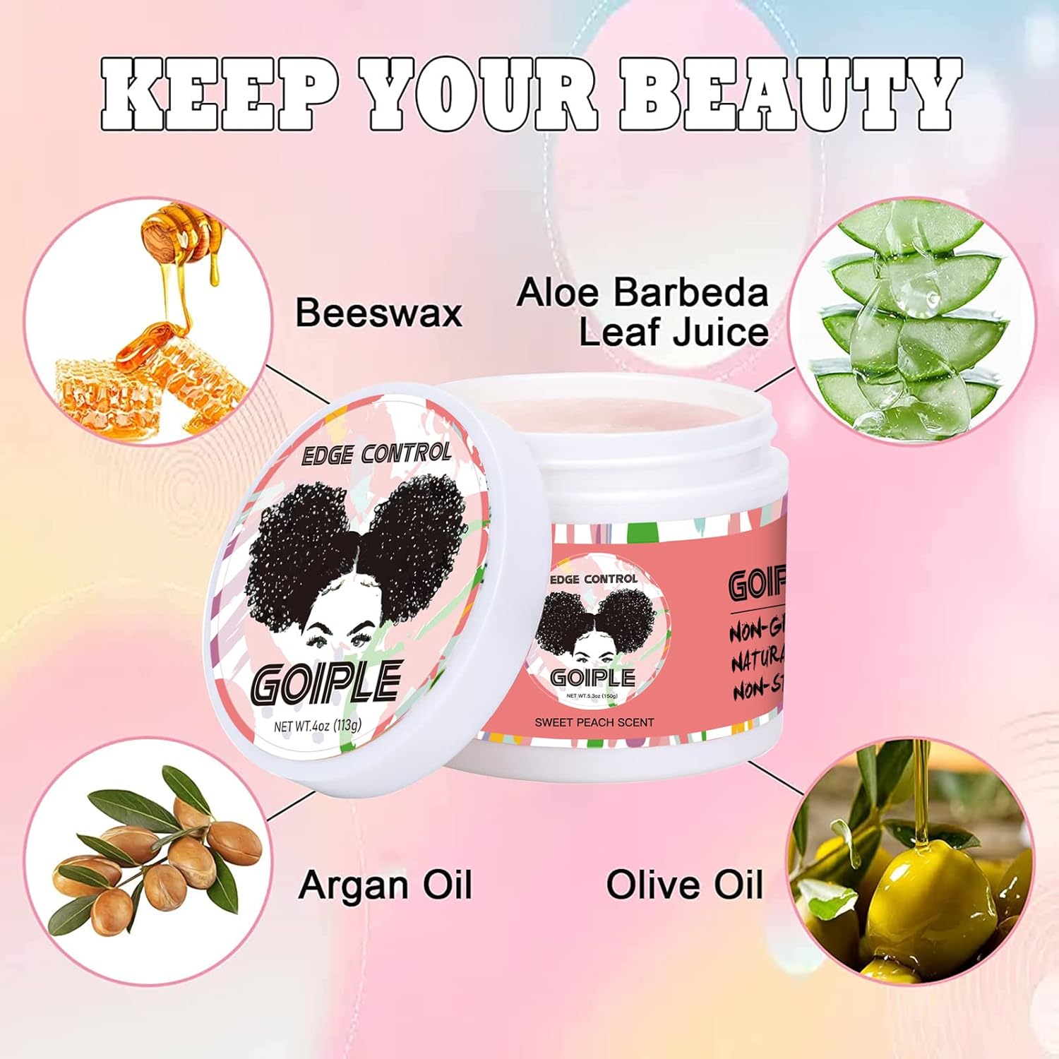 - Edge Control for Black Hair: This set included:1pc 4oz peach flavor edge control+1pc 1.05oz edge control+1pc elastic bands for wig+1pc hair comb+1 pc double-sided edge brush+1pc bristle brush.The tool is compele!