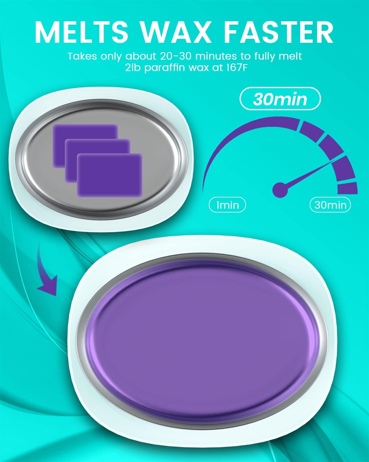 - Large Capacity / Quick Heat: paraffin wax machine has a large opening inner container , which offers you enough space to dip your hands, elbows or feet in paraffin warmer machine. Melts wax quickly and evenly , takes just 30 minutes to fully melt 2 lbs of paraffin wax at 167 Β°F. Turn Off the machine when dipping