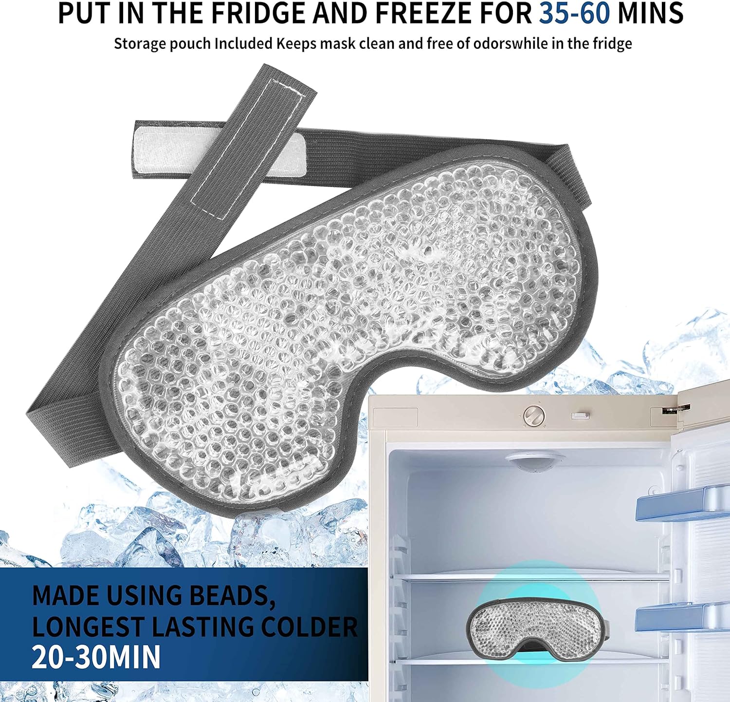- HOW TO USE: Put it in the refrigerator and freeze for 35-60 minutes.(Control time according to personal preference); No time limit on the refrigerator fresh-keeping layer. The ice eye mask comes with a resealable bag that helps for healthful storage and prolong the product lifetime or isolate the fridge odor
