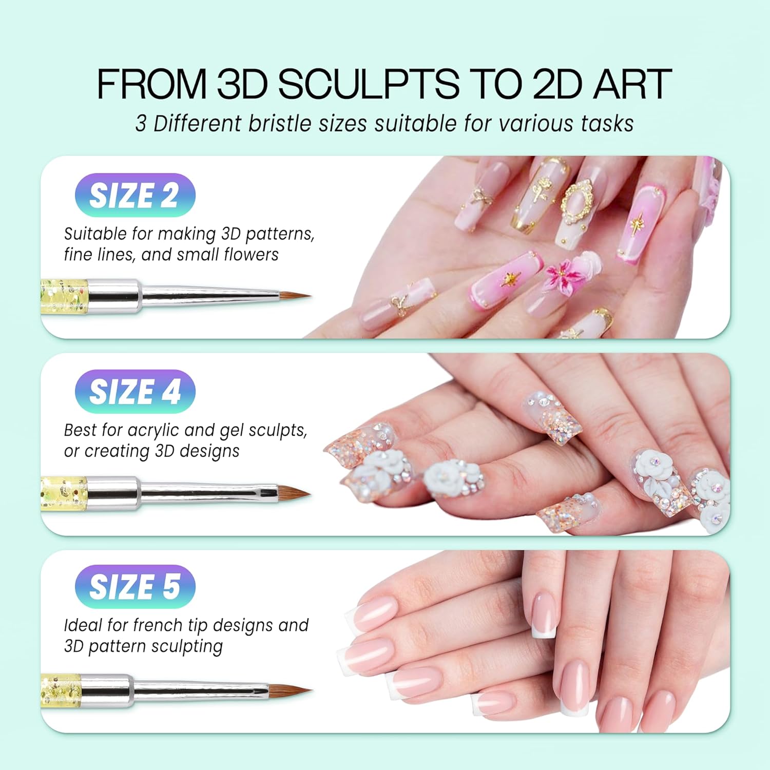 - Quantity: 1 piece | Color: Rainbow | Brush Size: 2 | Design: 3D Nail Art Sculpture Brush