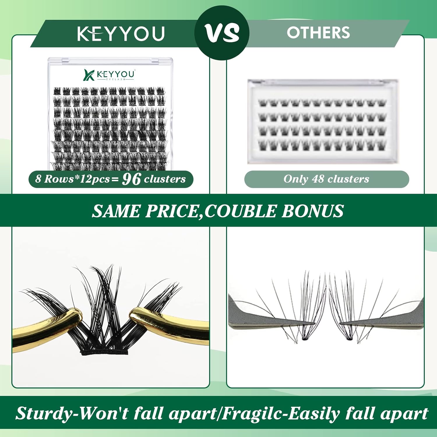 • 【Soft&Comfortable】KEYYOU lash cluster are made of imported materials,the stem line is thinner and softer, the eyelash cluster are lighter and more comfortable to wear.96 clusters in one tray ,more cost-effective.