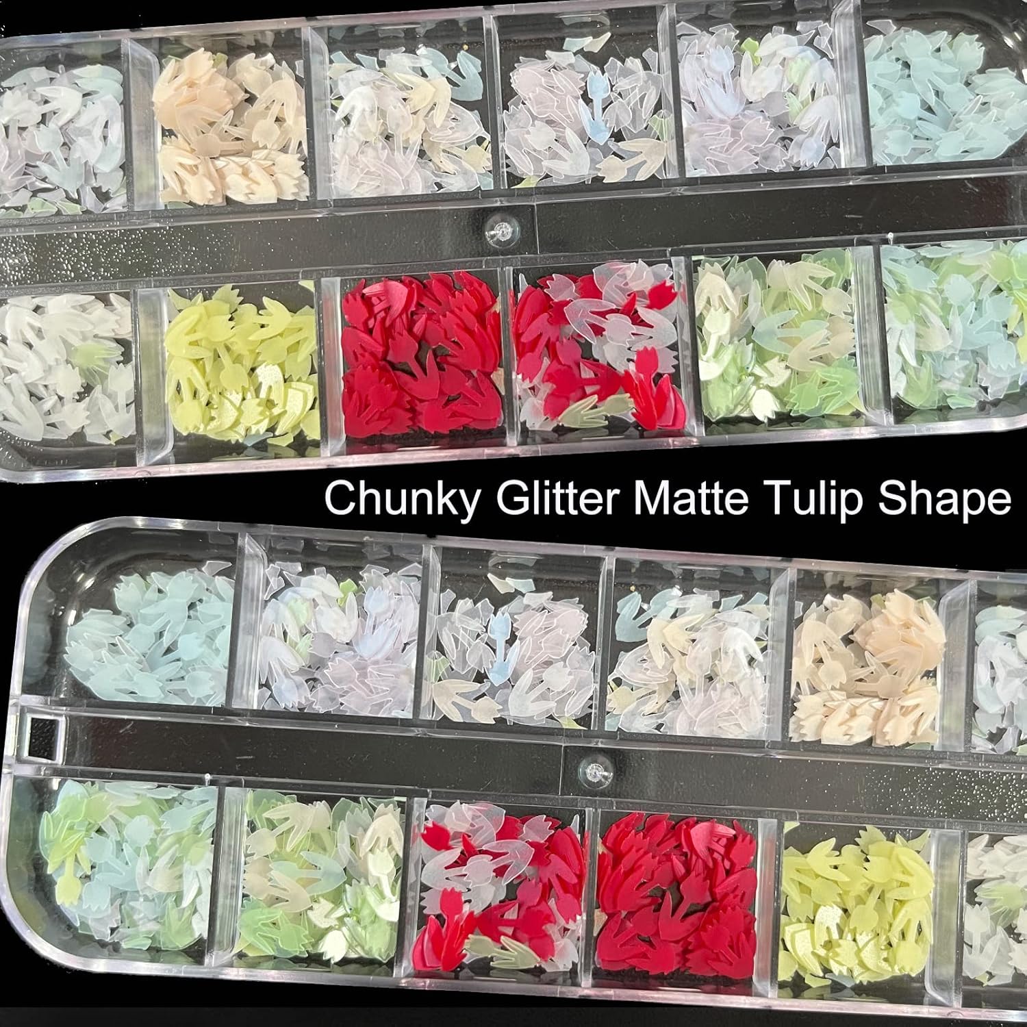 - Pretty colors and shapes, 1 box of 12 colors iridescent fluorescent hexagon nail glitter, 1 box of bright colors mixed shape star, heart nail sequins, 1 box of thin flower nail glitter flakes, 1 box of colorful flower heart butterfly rabbit chunky glitter