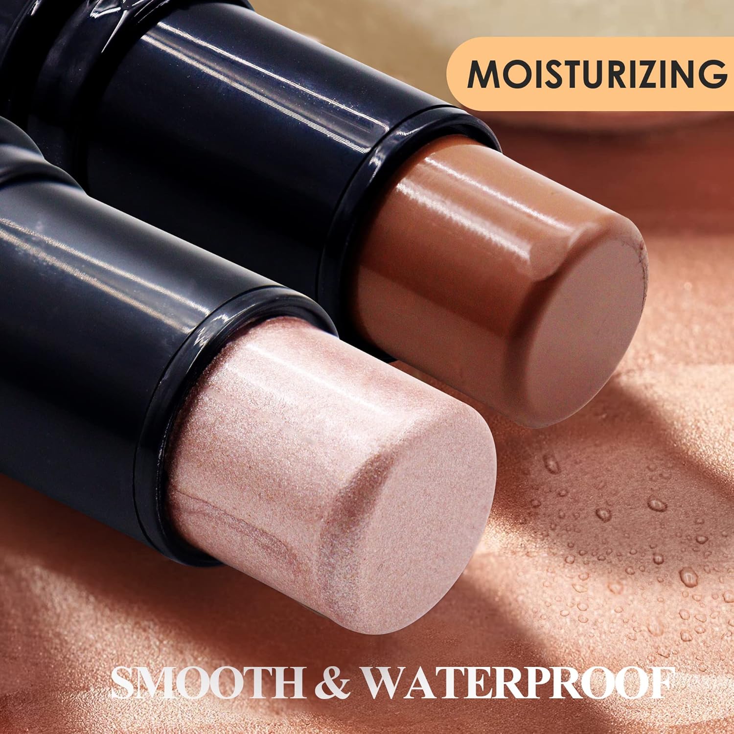 POPMISOLER 2 pcs Makeup Highlighter Stick & Cream Contour Stick, Natural Face Bronzer Stick Cool Toned Contour Kit for Beginners Waterproof Shimmer Highlight Stick, Brightening Foundation Stick