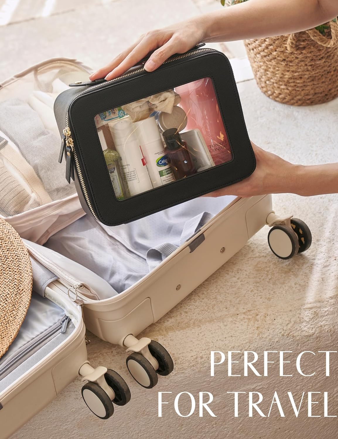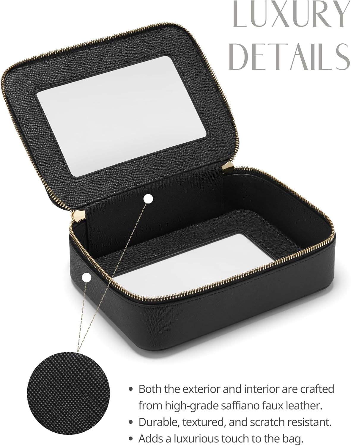 - [Premium Material and Durability] β The clear cosmetic case, both the exterior and interior, is crafted from high-grade saffiano faux leather, which is highly scratch resistant, durable and exceptionally easy to keep clean. It features a smooth zipper for secure closure, and elegant light gold metal hardware accents, adding a luxurious and sophisticated touch to the bag's overall design.