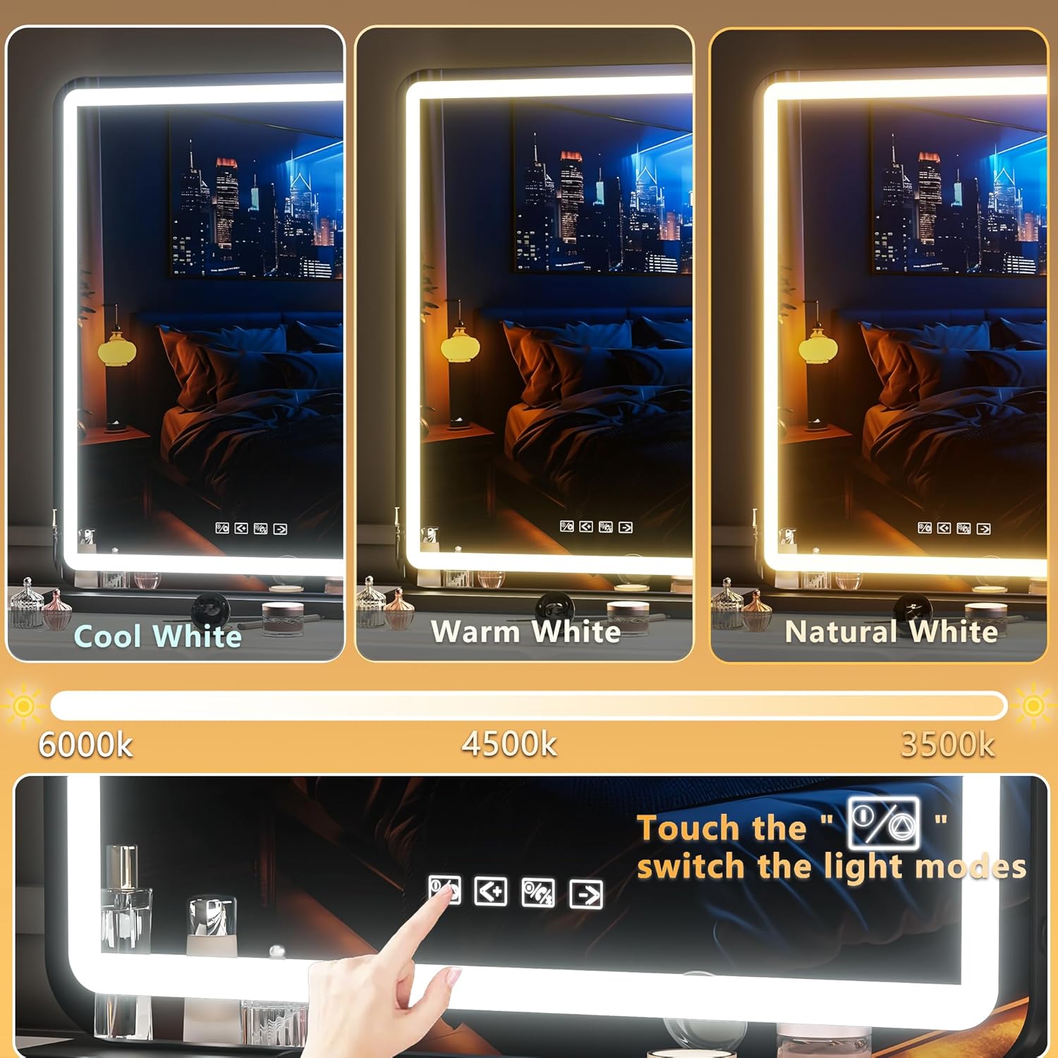 - 👍【Brightness Adjustable and 3 Color Lighting Modes】HASIPU lighted makeup mirror surrounded by 50,000 hours life Max 6000 Lumens high brightness LED Light Strip, with warm /natural /cold white three-tone settings, adjustable brightness 0%-100% can meet your personal makeup requirement.