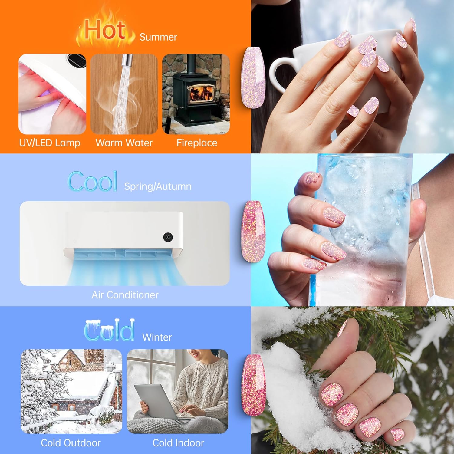 - Color-changing Brocade Glitter Gel :The gel changes color when the temperature exceeds 31°C or falls below 24°C, darkening as it cools and lightening as it warms. The colorful glittery brocade glitter in the gel creates a dazzling and radiant nail look.