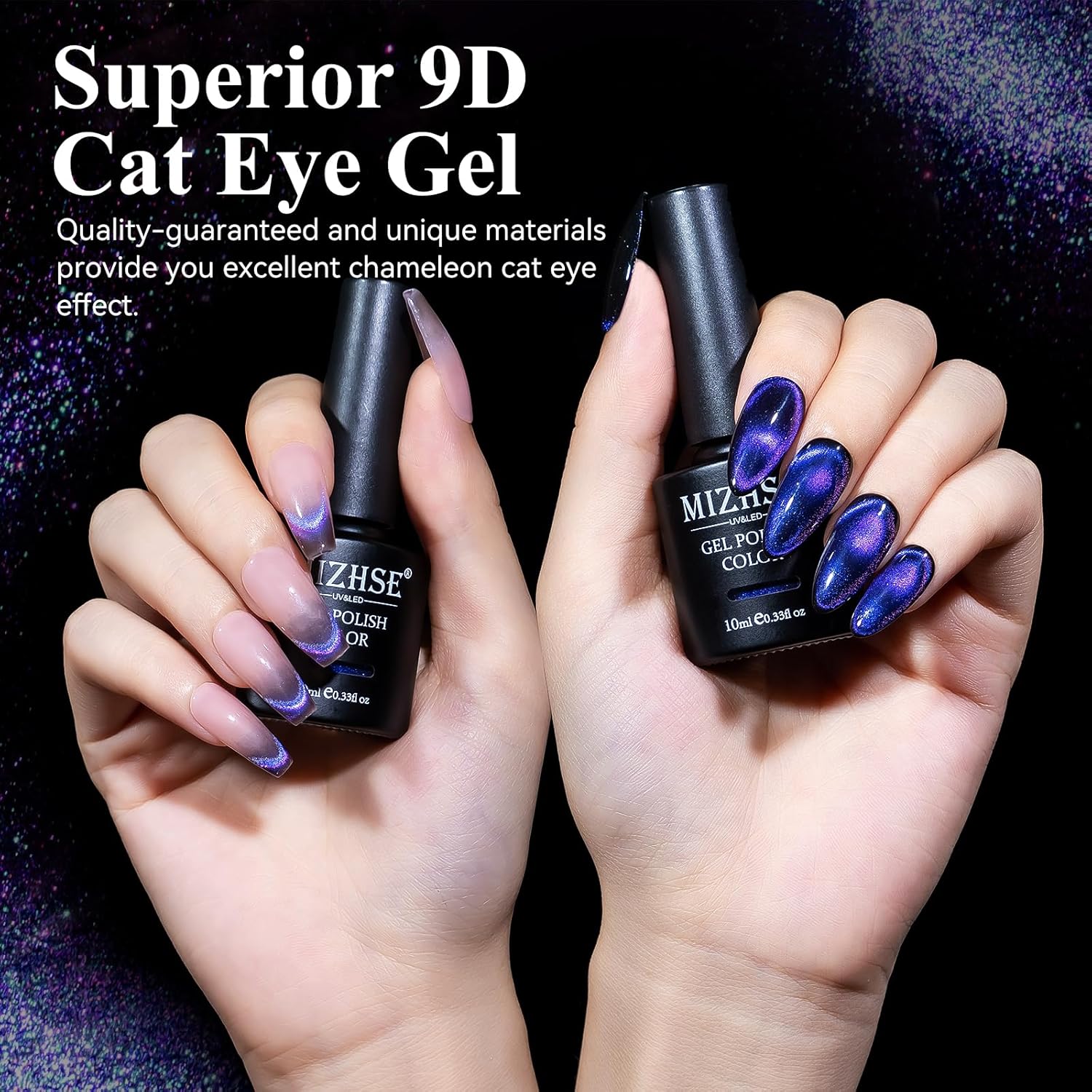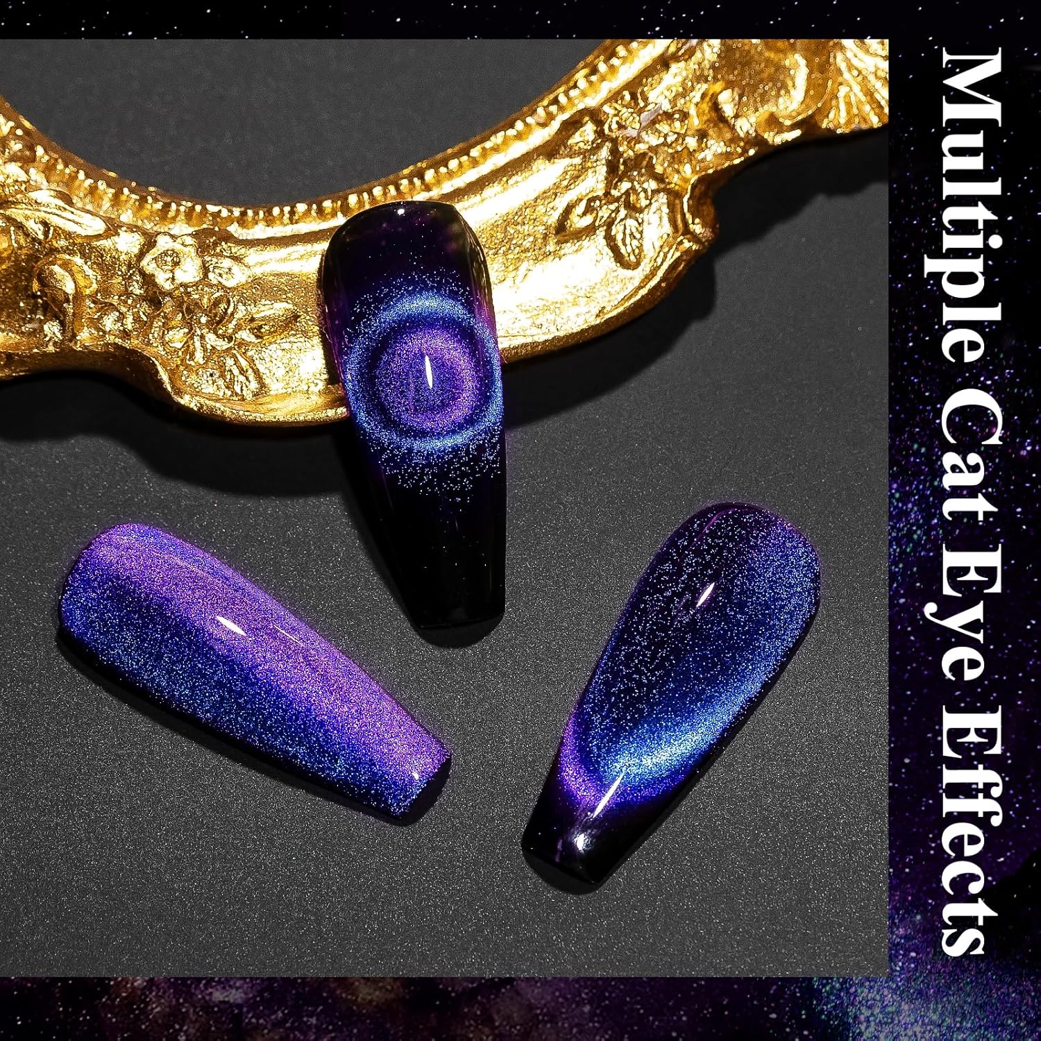 - Magic Galaxy Effect on Nails: Chameleon colors cat eye effect and holographic shimmer galaxy effect cateye nail gel brings you an amazing 9D cat eye effect on nails, to feel the gradient colors under different lights or angles.