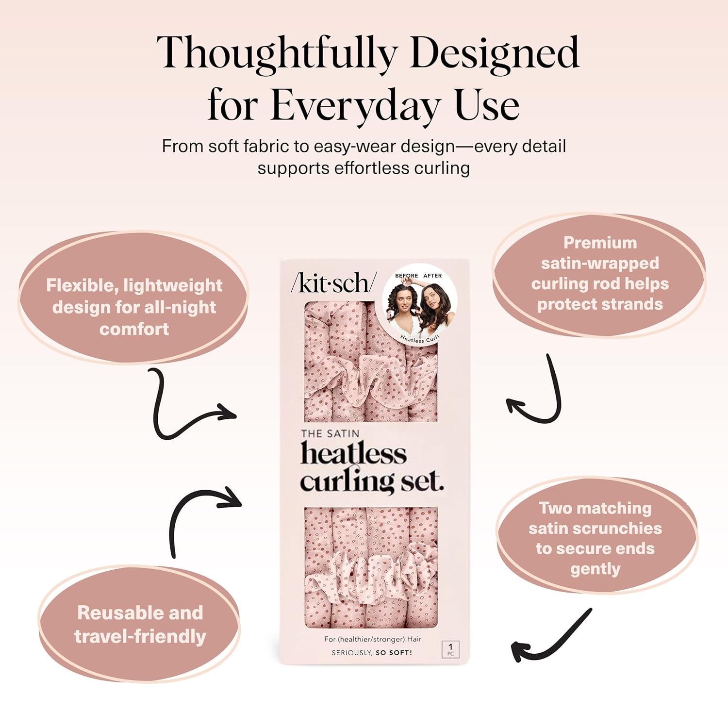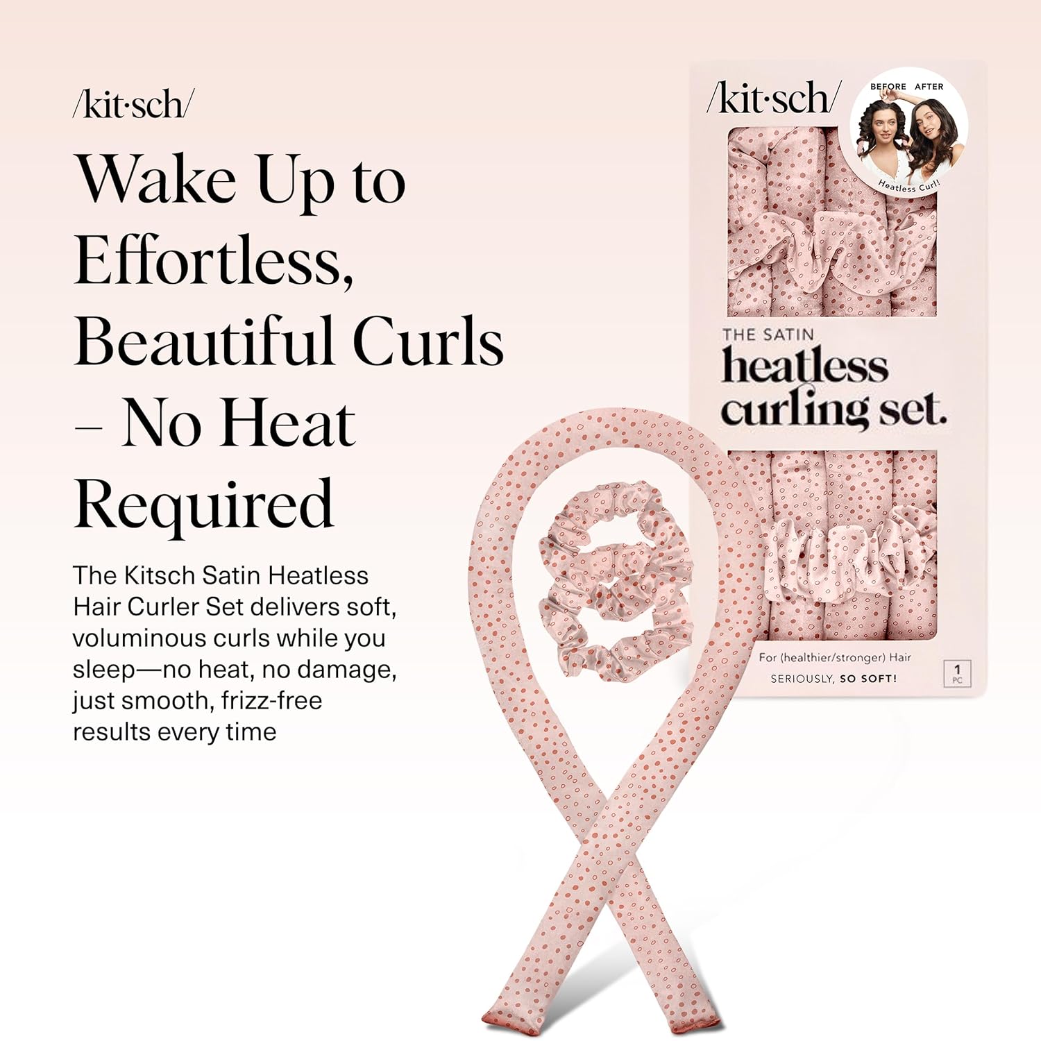 - COMPLETE SET FOR EASY STYLING: Everything you need for perfect curls: a 34-inch satin curling rod (1.25” diameter) and 2 satin scrunchies to hold your style in place. No noise, no heat, no cords—just a quick, easy way to achieve blowout roller results at home, every time.