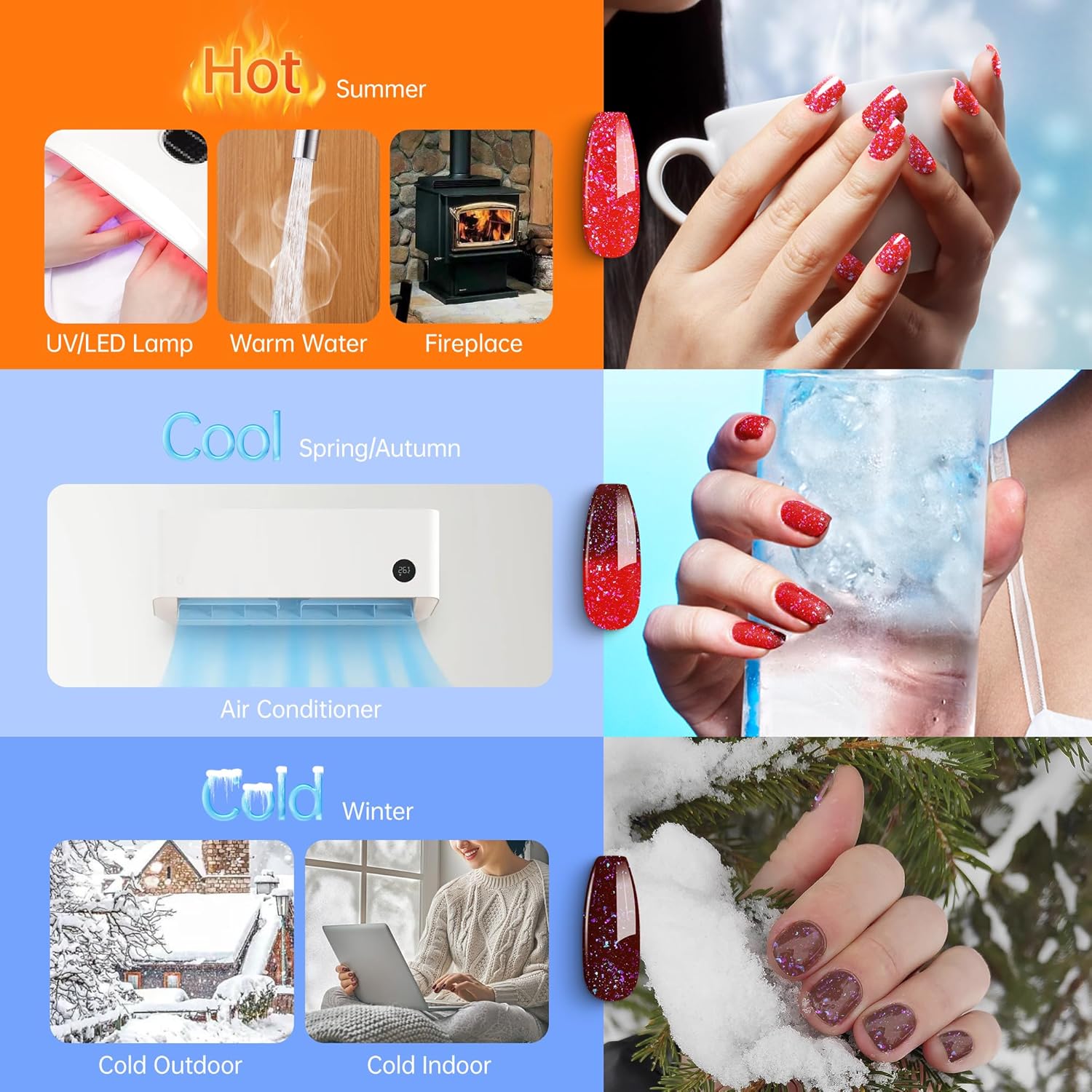 - Color-changing Brocade Glitter Gel :The gel changes color when the temperature exceeds 31Β°C or falls below 21Β°C, darkening as it cools and lightening as it warms. The colorful glittery brocade glitter in the gel creates a dazzling and radiant nail look.