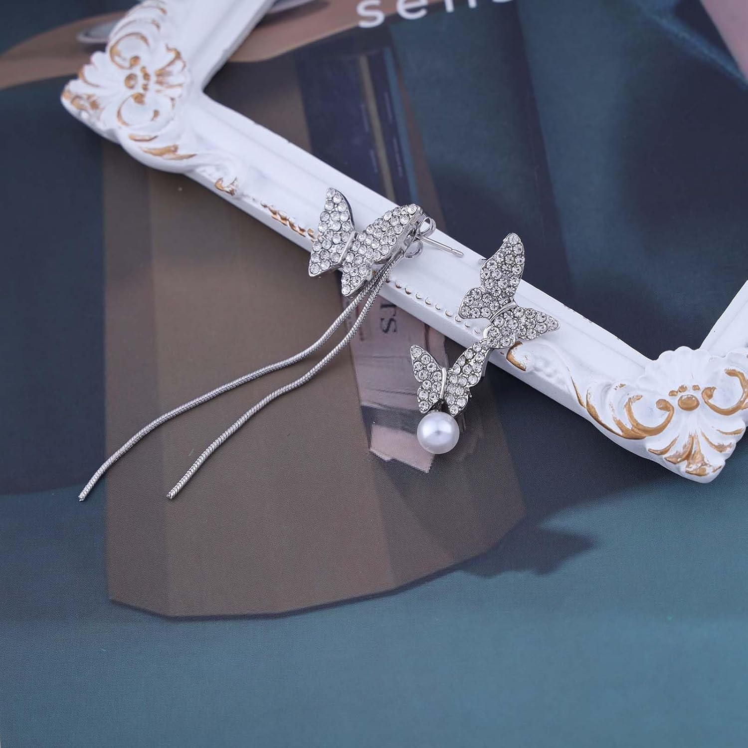 Vintage Crystal Butterfly Drop Earrings Rhinestone Pearl Dangle Earrings Long Butterfly Chain Earrings Silver Pearl Butterfly Earrings Jewelry for Women