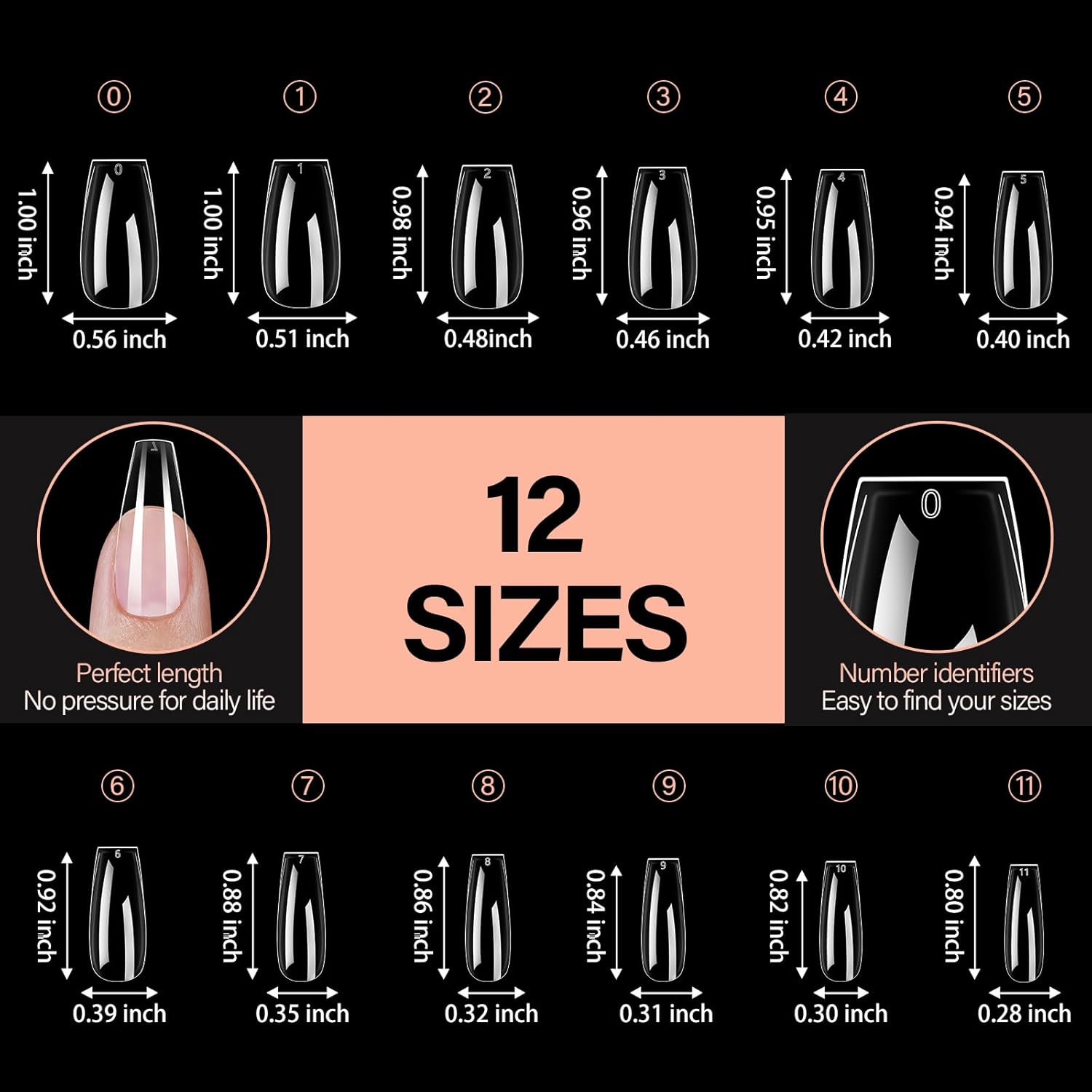 - Multiple Sizes Option: Our preshaped nail tips include different sizes with each size 42pcs, totally 504pcs, providing you with more options to choose. For the extra sizes, they can be easily trimmed and shaped to suit your preferences, giving you the freedom to express your creativity, avoiding waste. Regarding the dispute about the length of full nail tips, everyone’s nail bed length is different. It is recommended to refer to the size chart when purchasing.