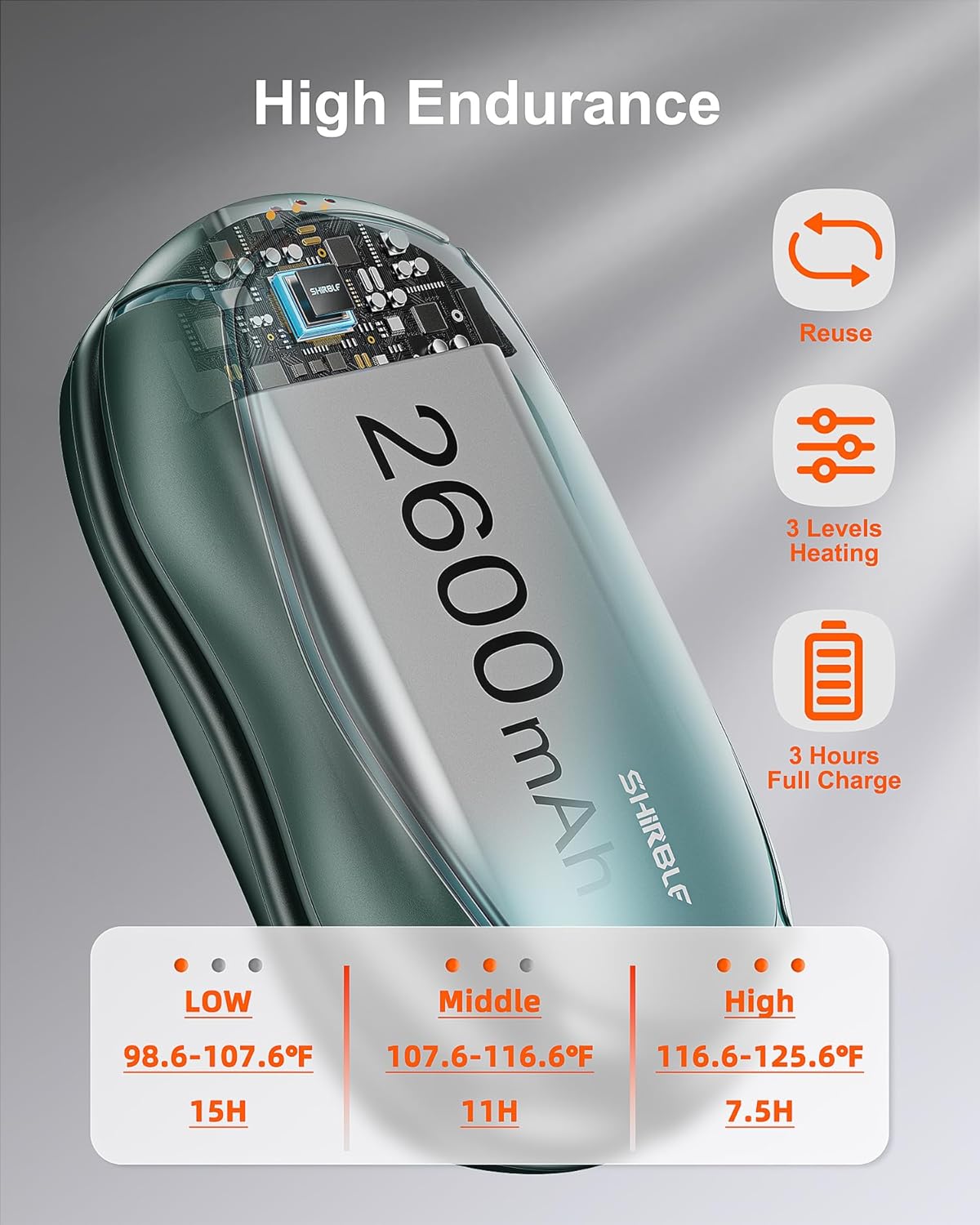 - 【Three Seconds Quick Heat】There is an on button on the top of the electric hand warmers rechargeable, press and hold for three seconds and the reusable hand warmer will turn on the heating to 105.8℉-114.8℉-125.6℉. Adjust the suitable temperature according to different temperature needs.