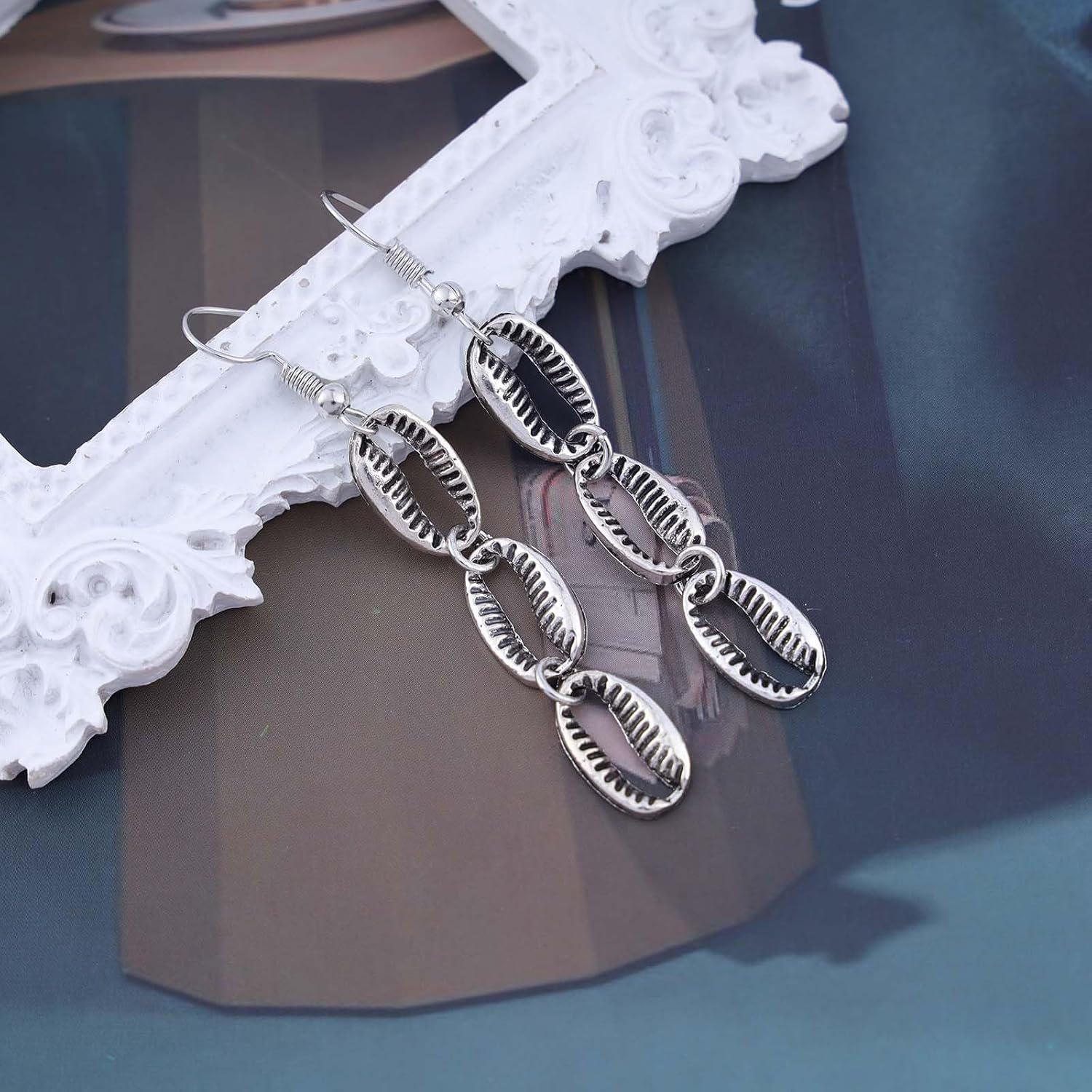 Boho Cowrie Shell Earrings Silver Shell Drop Earrings Vintage Sea Shell Earrings Long Metal Cowrie Earrings Jewelry for Women