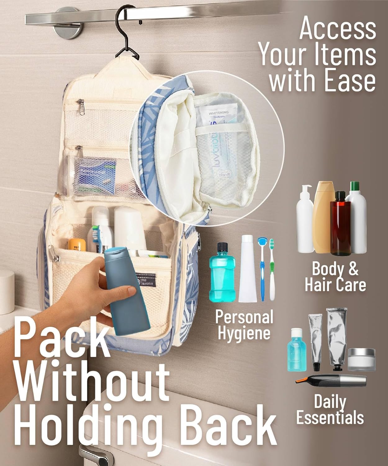 - Convenient Hanging Hook: The XXL metal swivel hook allows you to hang the bag anywhere, saving valuable counter space. It's perfect for use in hotels, bathrooms, or even on a camping trip.
