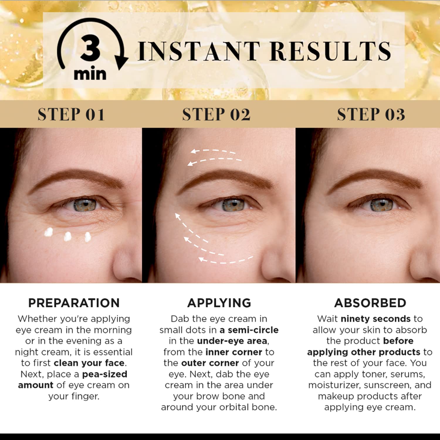 - 💜TIPS FOR APPLICATION: 1>Using a pea-size amount of the eye tighener cream, spread a thin layer onto eye area, don't apply any more than the recommended amount. 2>Please keep your face clean and dry before use. Anti aging eye cream should be applied before daytime moisturizer and sunscreen. If any white residue is noticed after applying the eye cream, it is advised to moisten a cotton swab or fingertip and gently pat the edges to remove the excess.