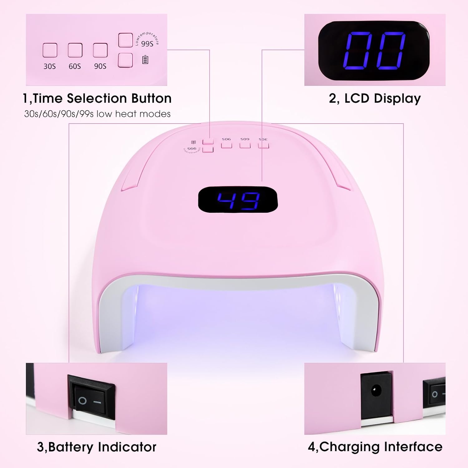 - Automatic Sensor & 4 Timer Setting: The rechargeable uv led nail lamp has a auto hand infrared sensor. It will automatically start when hands get in and automatically shut down when hands out or timer finish. The rechargeable gel led nail lamp has 4 timer setting, 30s,60s,90s,99s. Dry your nail gel seconds